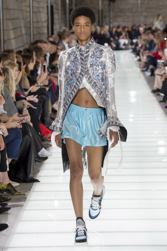 Comme l'on peut s'en douter, on laissera sans regret au premier ses shorts de boxe agrémentés d'une redingote Louis XVI (Louis Vuitton) et ses totals looks post séance de motocross (Fenty x Puma) pour se concentrer sur les suggestions du second, au sein duquel deux créateurs retiennent particulièrement l'attention.