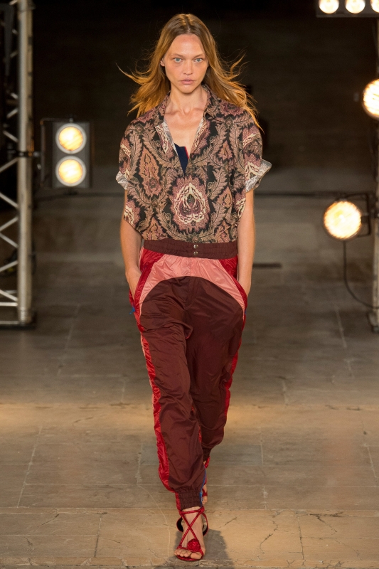 On pense tout d'abord à Isabel Marant, qui est récemment parvenue à rendre le bas de jogging totalement désirable. En choisissant de marier trio bordeaux/vieux rose/rouge, texture nylon et découpes sporty/rétro, elle réussit en effet à livrer un modèle hybride donnant envie d'être porté avec la fameuse nonchalance parisienne chère à la quinquagénaire. Niveau dress code, on retient l'idée de travailler l'ensemble de la tenue dans un camaïeu de teintes plus ou moins flou. Bien entendu, les baskets sont ici à délaisser au profit de sandales plates boho/minimalistes.