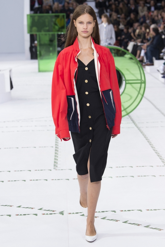 Dans un autre registre, Felipe Oliveira Baptista s'emploie chez Lacoste à faire cohabiter les atours classiques d'une élégante des années 80/90 avec la décontraction de la veste de jogging. Revisitée en coupe-vent color-block ou en modèle XL graphique, cette dernière apporte une dimension emprunte d'improvisation charmante à la rigueur "sexy austère" des robes qu'elle réchauffe. Une idée relativement simple - mais aussi et surtout facilement reproductible - qui lui permet de proposer des looks aussi forts qu'impactants..