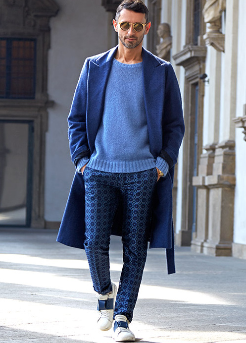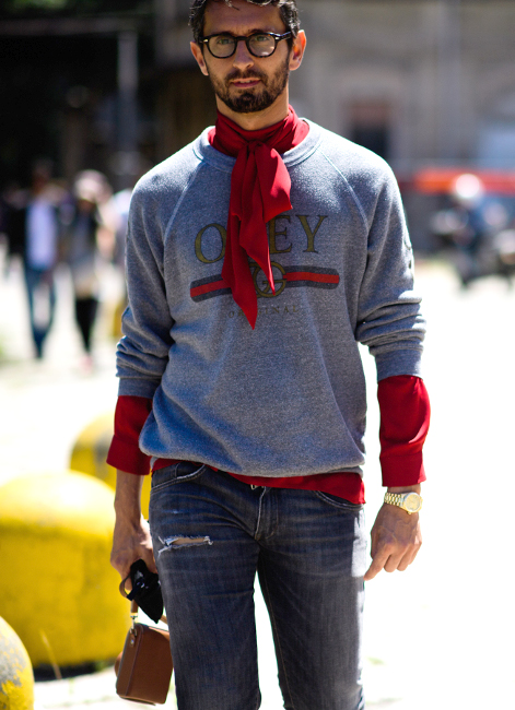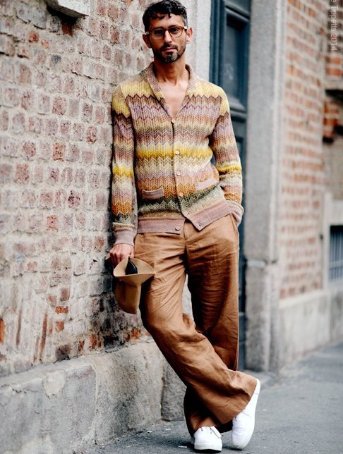 S'amuser à contrarier le sérieux de ses pantalons de costume en leur adjoignant d'épais pull-overs graphiques et colorés (voir ici). Superposer parka et pardessus (voir ici). Porter sa chemise hawaïenne non pas avec le duo short/tongs, mais plutôt avec le tandem jean roulotté sur la cheville/derbies (voir ici). User et abuser des associations camaïeux de teintes fauve/baskets blanches (voir ici). Contrarier volontairement la dégaine technique du K-way en le mariant à des textures plus ouvragées (ici les fameux zigzags Missoni). Troquer sa veste de costume contre un modèle inspiré des vestes de karaté et le porter ceinturé sur un pantalon droit de même teinte (voir ici). Patiner l'excentricité d'un pantalon imprimé en l'accompagnant de pièces classiques (ou faussement classiques).