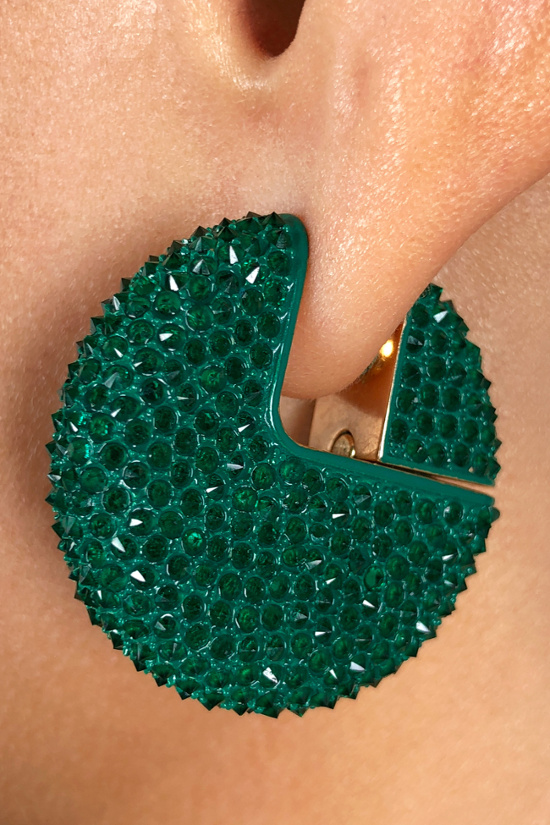 Son bijou : une paire de boucles d'oreilles plateaux aux strass venimeux (voir ici).
