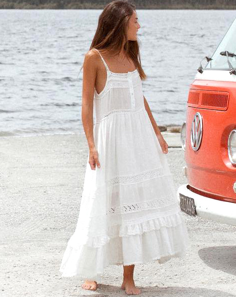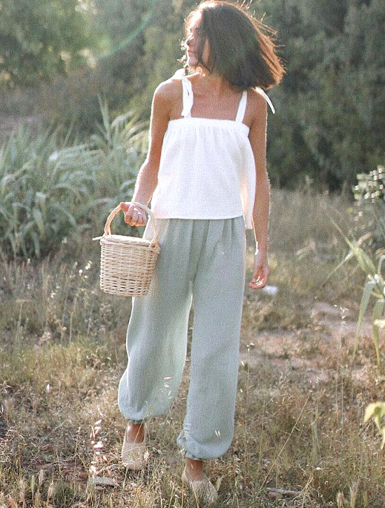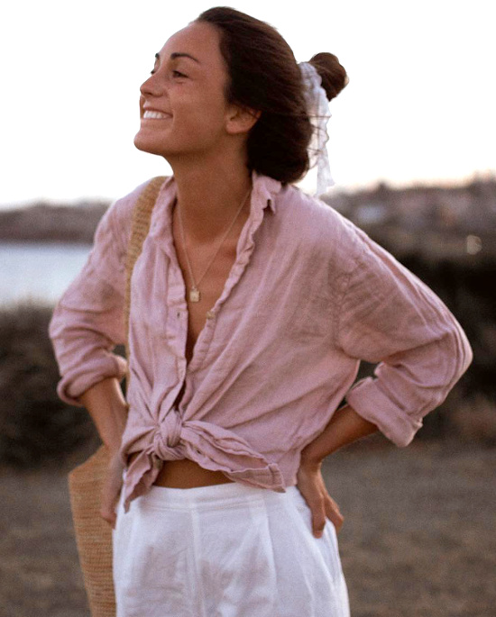 Produites à Bali dans des conditions éco-friendly, les pièces en lin ou gaze de coton de la marque Heron séduisent régulièrement Miren Alós. Il faut dire qu'avec leur simplicité à fleur d'étoffe, leur sensualité maîtrisée et leur coloris tendre, celles-ci correspondent à la perfection à la charte éthique de la jeune femme. Mention spéciale pour le modèle Levi qui, avec son profond dos nu, ses poches latérales et son ampleur légère, semble avoir été conçu pour arpenter une plage de sable fin.