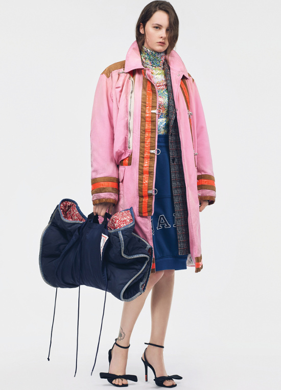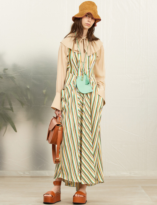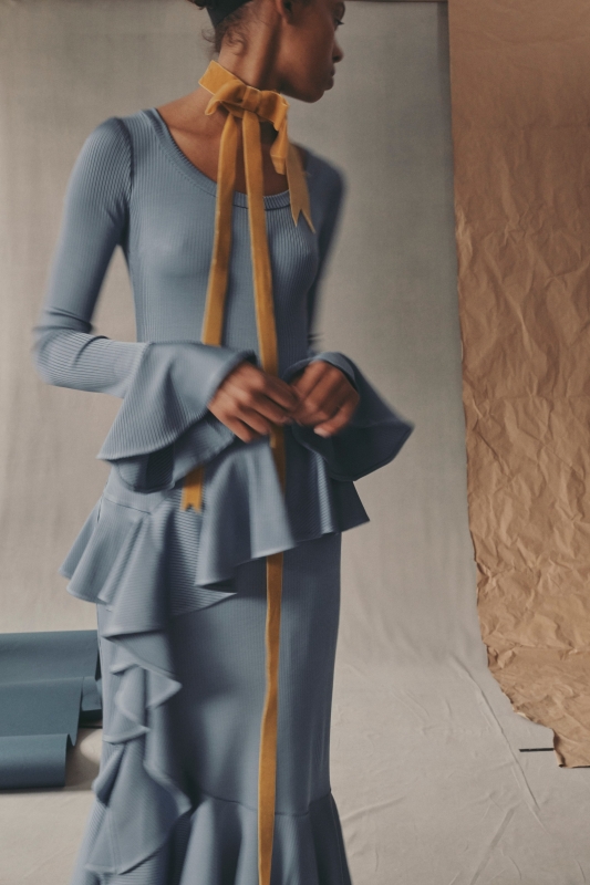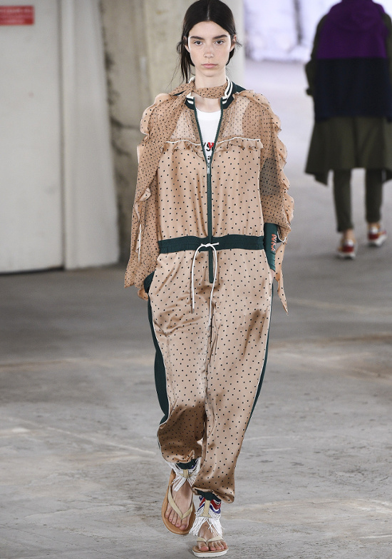 Le vert sapin étant d'ordinaire davantage associé aux vêtements utilitaires qu'aux délicats déshabillés, il n'est guère aisé de lui conférer une aura délicate. C'était cependant sans compter sur Chitose Abe qui, en mariant ses mailles vert profond à des étoffes féminines nude et en relevant le tout d'une pointe de blanc, offre au vert forêt une inédite douceur chic (Sacai).