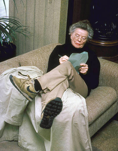 Katharine H., c'est mon idole totale de style depuis toujours (avec Jarvis Cocker, dans un autre genre mais pour les mêmes raisons), parce que, comme aurait dit ma grand-mère, elle avait du chien. À tout âge, en toutes circonstances, rien de mièvre dans ce qu'elle dégage, rien d'artificiel malgré le carcan de sa classe sociale et l'intense formatage qui sévissait (et sévit toujours) à Hollywood, et toutes ces contradictions qu'elle a trimballées avec panache sans jamais s'excuser (la délicieuse peau de vache), je trouve que ça se voit dans sa manière de s'habiller.