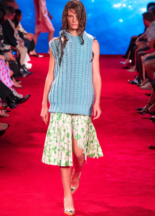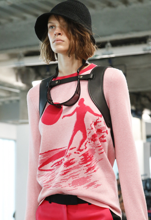 A la fois portable et propice à moult digressions stylistiques, le duo jupe/pull long inspire les passages les plus seyants des shows Marc Jacobs et Calvin Klein. Décliné chez l'un sur une tonalité très "eighties Saint Laurent" (voir ici et là) et chez l'autre dans un esprit "cosy subtilement ironique" (ici et là), ce tandem parvient - à défaut d'être novateur - à renouveler le genre avec finesse et modernité. Anna Dello Russo s'essaie au photobombing (voir ici). Entre pull-overs pour touristes en goguette sur la côte californienne (voir ici et là) et imprimés floraux manquant cruellement d'élégance (voir ici), l'excès de références premier degré parasite de manière dommageable la collection Michael Kors. Alors qu'on la croyait en train de tenter sa chance à Hollywood, Tavi Gevinson fit une apparition surprise sur le podium de la griffe CDLM. De son côté, Lourdes Leon (la fille de Madonna) s'est elle aussi essayée au mannequinat, cette fois-ci chez Gypsy Sport... Coupées dans des étoffes relativement simples (coton, jean…) et produites en Amérique, les pièces de la collection Proenza Schouler afficheront en boutique des prix nettement moins élevés que d'ordinaire. Dommage que ces dernières manquent une fois de plus cruellement de fashion appeal (ici et là)... Giovanna Engelbert fait rimer mode pointue et grossesse (voir ici et là).