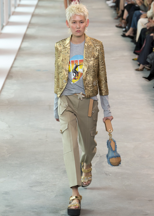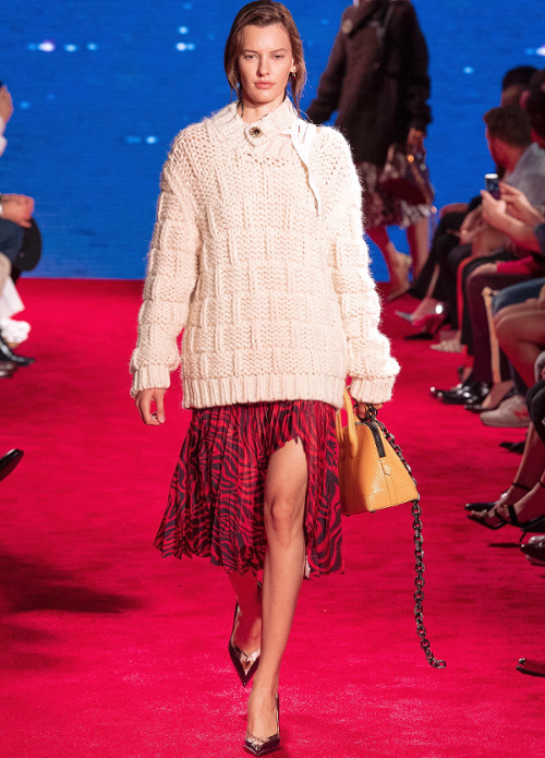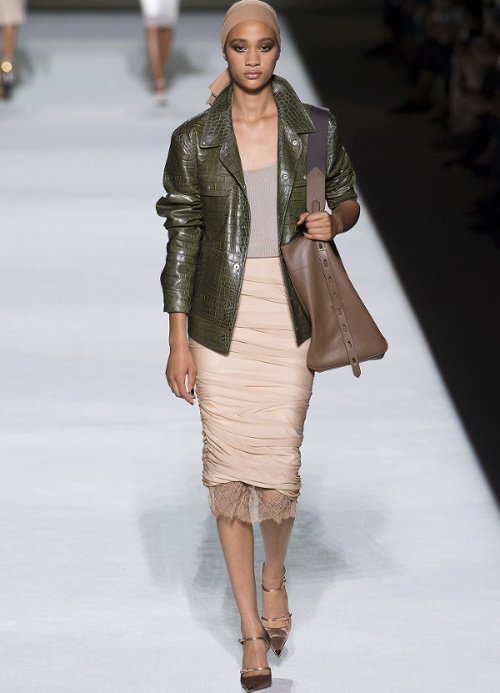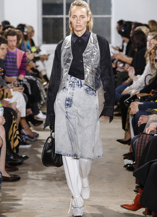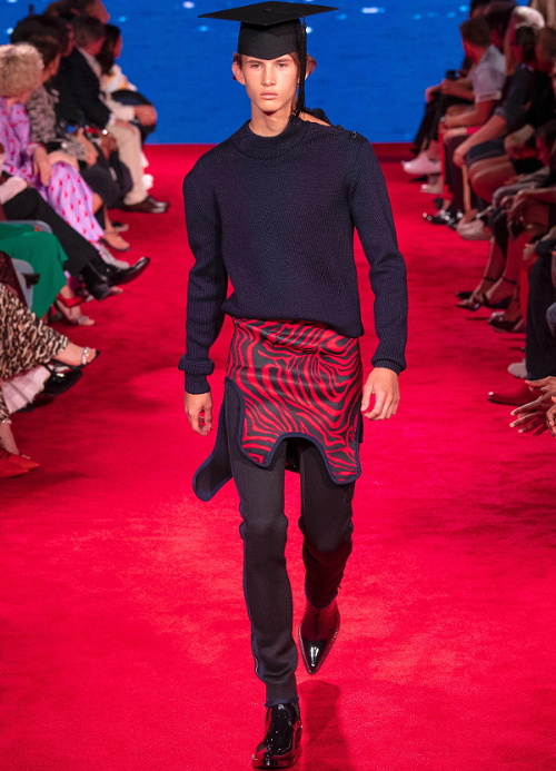 Entre combinaison en néoprène pour jeune diplômée en quête de sensation forte (voir ici), prom dress apparaissant écrasée par une nuit torride passée sur la plage (voir ici) et références marquées au film "Les Dents de la mer" (voir ici), Raf Simons continue de sonder les entrailles de la pop culture américaine. A l'occasion des 50 ans de sa griffe, Ralph Lauren offre un shoot de multiculturalisme à son univers 100% américain en optant pour des mannequins aux origines diverses (voir ici, ici, ici et là). Aussi excentrique soit le travail de Jeremy Scott, il n'en parvient pas moins chaque saison à produire une ou deux mignardises fashion qui feront systématiquement mouche auprès des fashionistas. Le printemps/été 2019 ne fait pas exception à la règle : ses sweat-shirts et autres tee-shirts Popples seront à n'en pas douter des best-sellers. Tom Ford renoue cette saison avec ses années Gucci en proposant des silhouettes sensuelles et portables. Le duo jupe fourreau esprit lingerie/blouson un brin large en peau luxueuse (voir ici et là) ne devrait pas laisser indifférentes les groupies du designer texan... Entre taille gainée et volume démarrant bas sur les hanches, la coupe des jupes Marc Jacobs apparaît particulièrement flatteuse (voir ici et là).