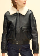 On s'amuse ici avec la confrontation des imprimés noir et blanc. Le blouson en cuir pourra être remplacé par un bomber en velours (ou en daim noir). Une queue de cheval haute accompagnera idéalement ce look.