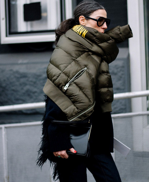 Transformer sa doudoune en écharpe à part entière (voir ici). Equilibrer les volumes oversizes, masculins et de teintes organiques au contact d'un petit sac en cuir rigide au coloris un brin plus vif (voir ici). Une fois bien couverte, ne pas hésiter à porter en étole une épaisse écharpe. Elle ne réchauffera pas le corps, mais accentuera la dimension cosy du look (voir ici). Faire du total look noir un prétexte à des mix and match audacieux (voir ici). Détourner l'ADN utilitaire d'une pièce (ici un imperméable en plexiglas) en la traitant de manière ultra chic. Renouveler le duo marinière/blouson en cuir en lui ajoutant un pull fin à très large col V (voir ici).