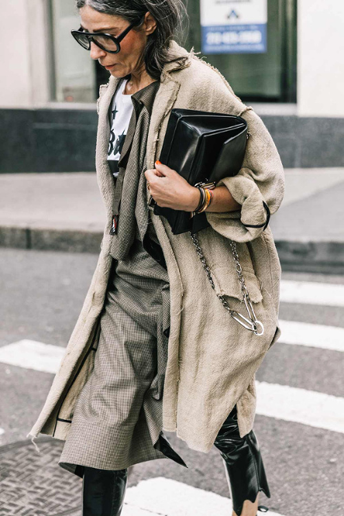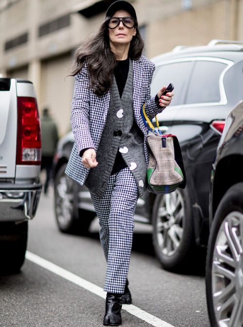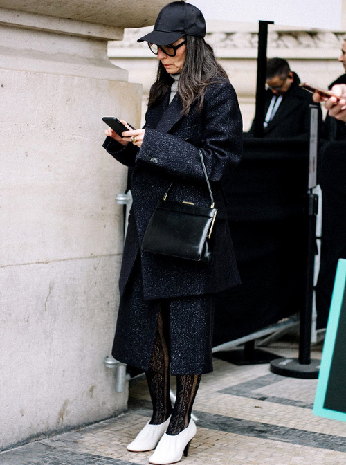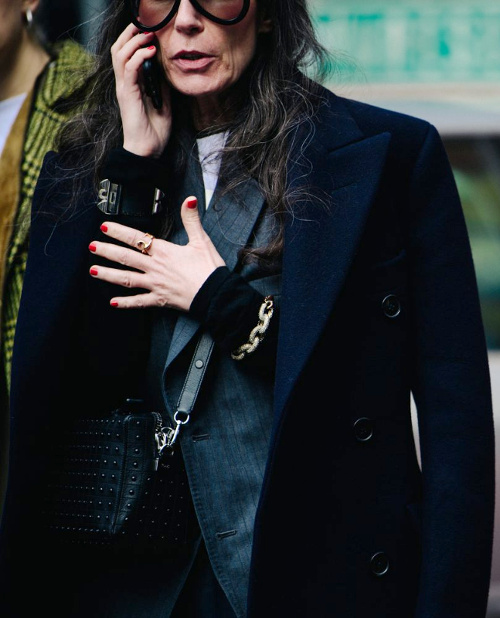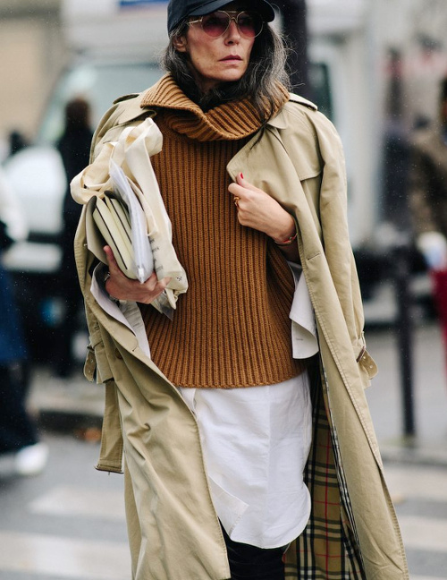 Associer vert lichen et bleu cobalt (voir ici). Faire la part belle à des manteaux s'appuyant sur le classicisme de leur coupe (ici le trench) pour s'autoriser un coup d'éclat graphique. Déjouer la nature classique du tandem noir et blanc en misant sur des pièces de caractère (voir ici). Décider de renoncer aux teintures et d'assumer ses cheveux gris (voir ici et là). Marier veste type Chanel et pantalon large à pinces (voir ici). Préférer la casquette au bonnet (voir ici).