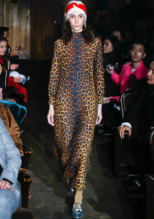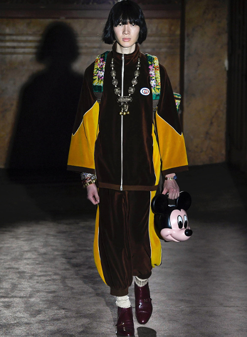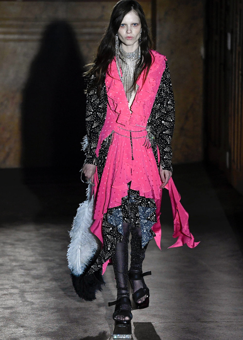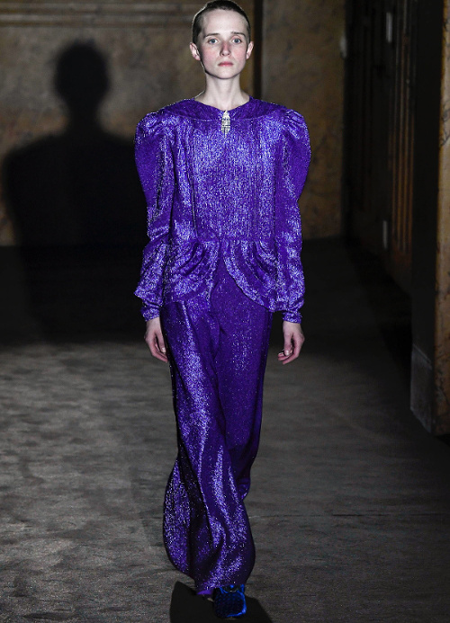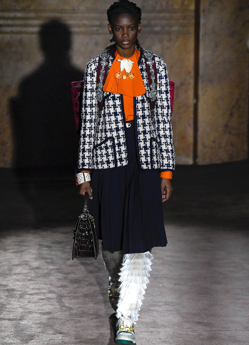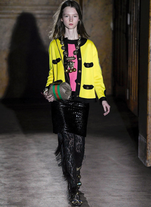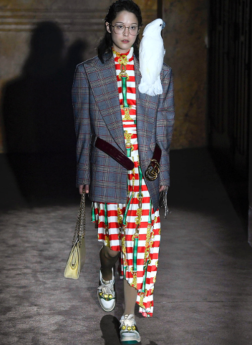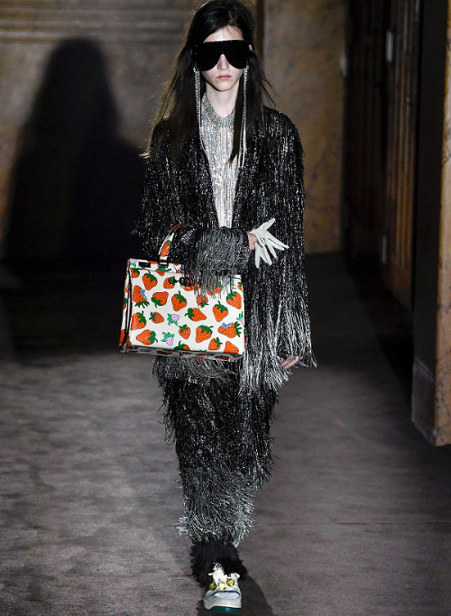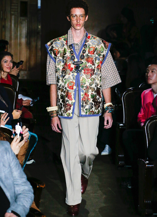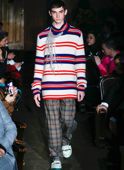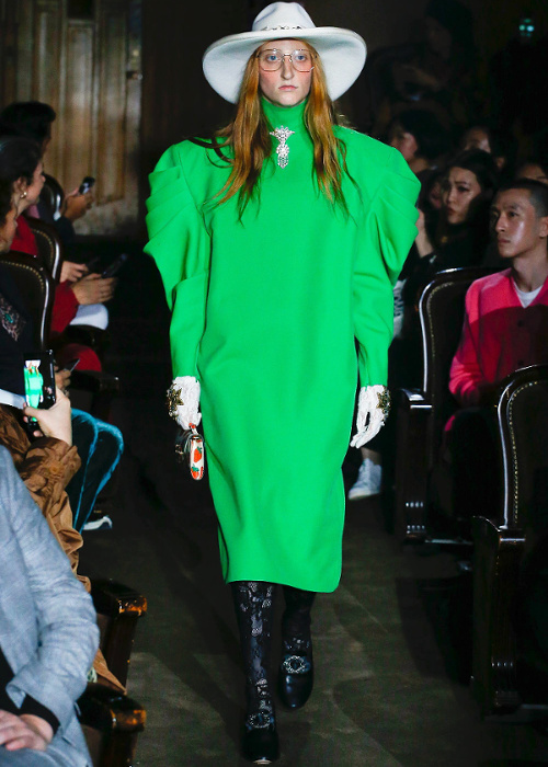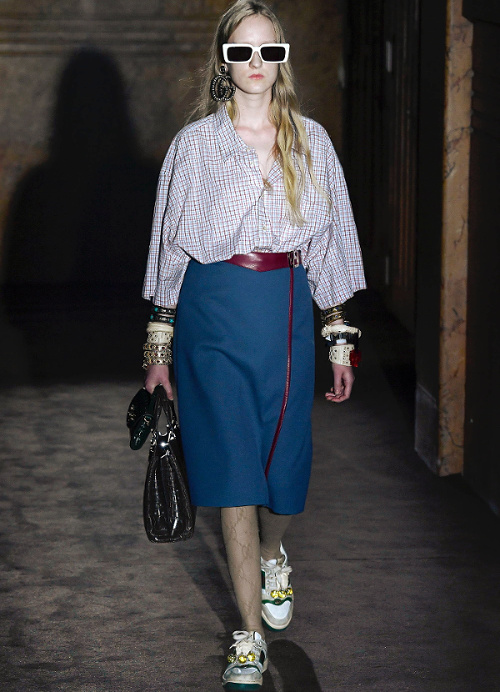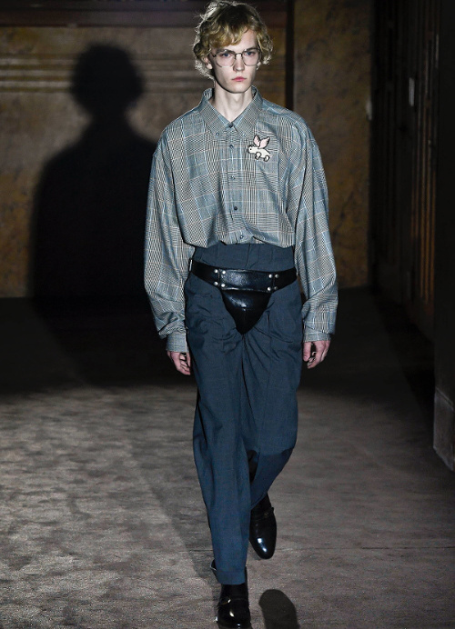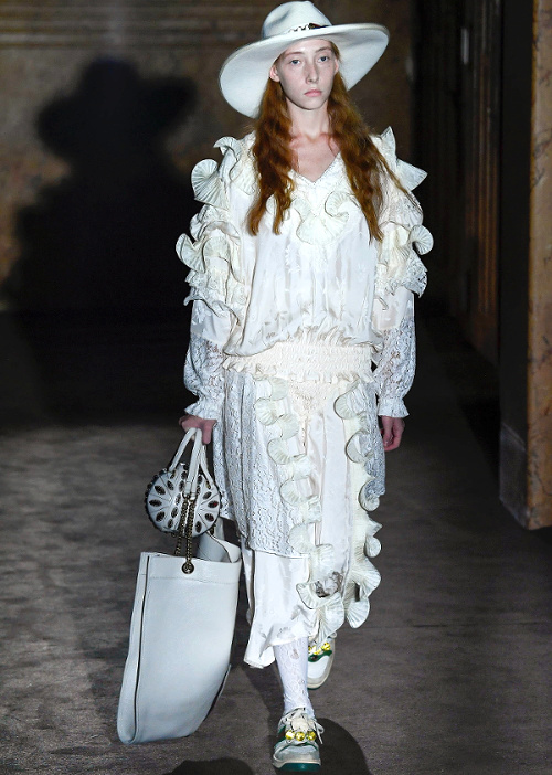 S'il est toujours aussi amusant d'imaginer la vie des personnages Gucci, force est néanmoins de constater que l'opus printemps/été 2019 n'est guère le meilleur cru d'Alessandro Michele. Outre le caractère extrêmement répétitif de sa grammaire stylistique, l'outrageuse fantaisie qui fait d'ordinaire le sel de ses collections manque en effet ici de panache, les références aux années Palace se faisant caricaturales et les accessoires moins mystérieux que d'ordinaire. La logorrhée créative de Michele serait-elle en train de se tarir ?