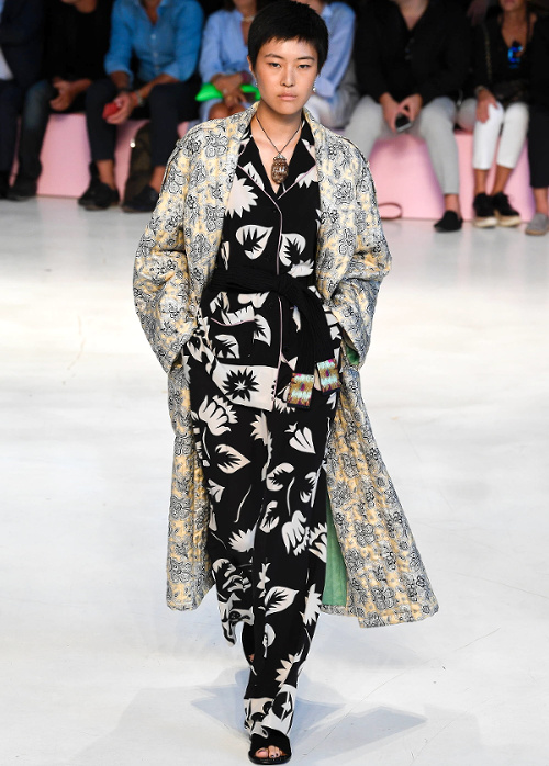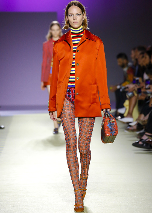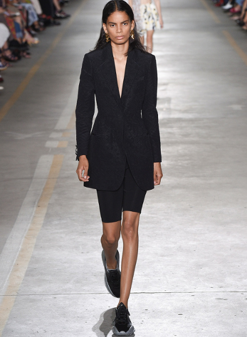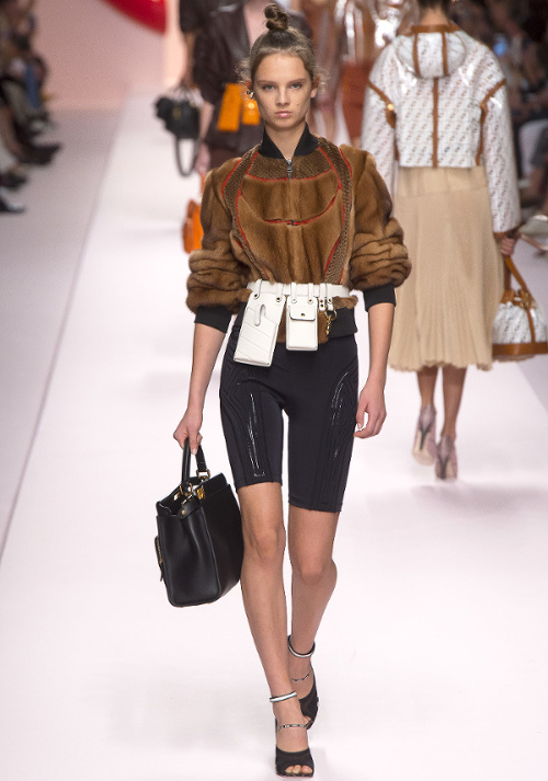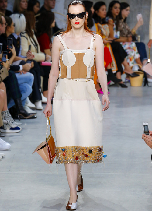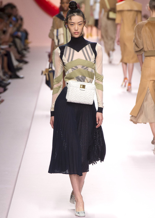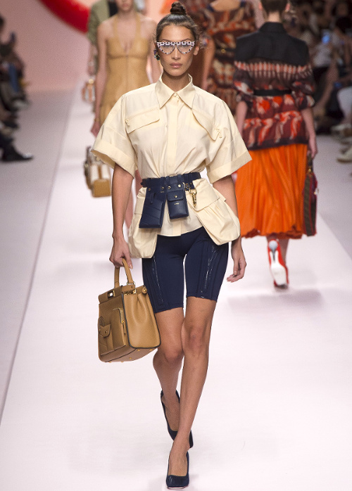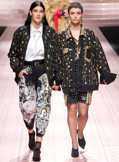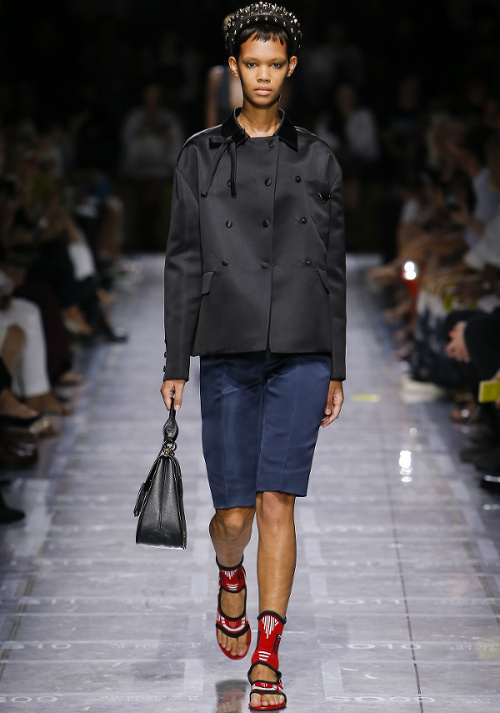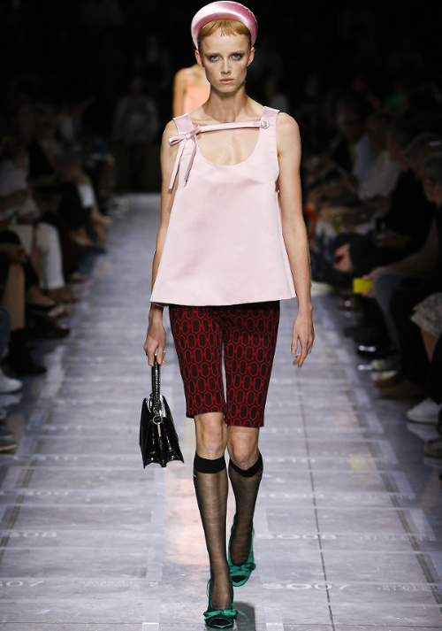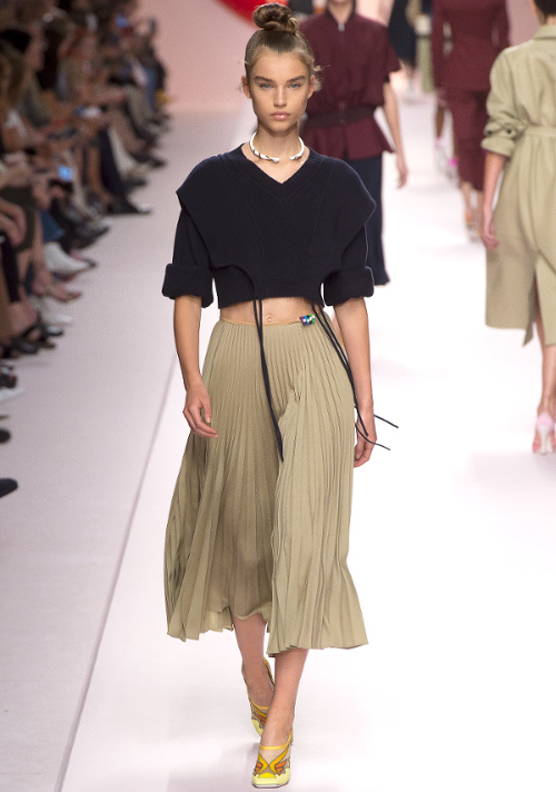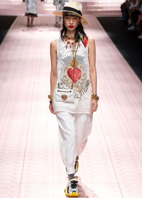 Mariant esthétique sixties et rigueur de l'uniforme, Miuccia Prada livre cette saison un vestiaire cérébral à la fantaisie forcée où la rigidité des matières, l'adoubement du cycliste et les détails sexy-conceptuels tiennent le désir à distance. Si l'on souhaite trouver de quoi activer nos zygomatiques fashion, c'est ainsi du côté des accessoires qu'il faudra - comme souvent chez Prada - jeter un oeil. Le serre-tête à studs esprit auréole machiavélique (voir ici, ici et là), les lunettes papillons à pastilles et les sacs en cuir tie&dye seront en effet à coup sûr des must have… On méditera sur ces quelques phrases livrées en backstage par Miuccia Prada : "What worries me is simplification. Because politics is run by slogans - or not even that, by a hashtag. If you take away content and simplify, at a certain point you can't say anything." Les sublimes pantalons larges de Marco de Vincenzo donnent envie de brûler nos jeans mom (voir ici). Chez Fendi, le short cycliste savoure son statut de "it" pièce et n'hésite pas à faire référence à sa nature utilitaire/sportswear en se portant avec une ceinture pour aventurière urbaine où l'étui à iPhone remplace le baudrier (voir ici et là)... En combinant plissé vaporeux vert lichen, lainage bleu marine et touche de jaune (voir ici), Karl Lagerfeld parvient à rendre le cropped presque chic. Par ailleurs, lorsqu'il utilise un tissu subtilement perforé (qu'il a subtilisé à l'univers sportswear), il contredit avec esprit l'austérité de certaines de ses jupes plissées Fendi (voir ici et là). Via un casting haut en couleur faisant la part belle aux différentes formes de diversité (morphologies, genres, générations et origines), Domenico Dolce et Stefano Gabbana tentent de faire oublier à quel point leurs collections sont redondantes, voire peu seyantes.