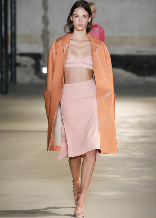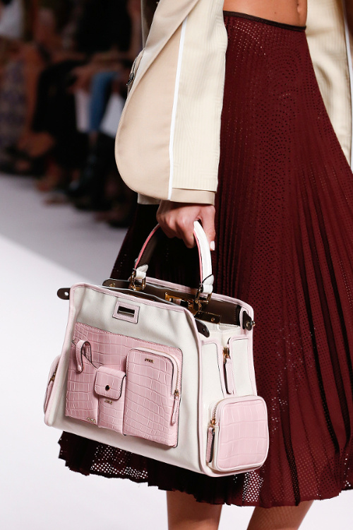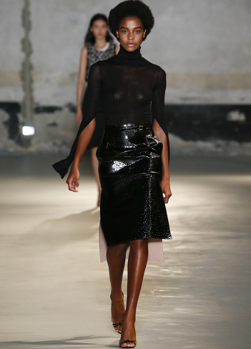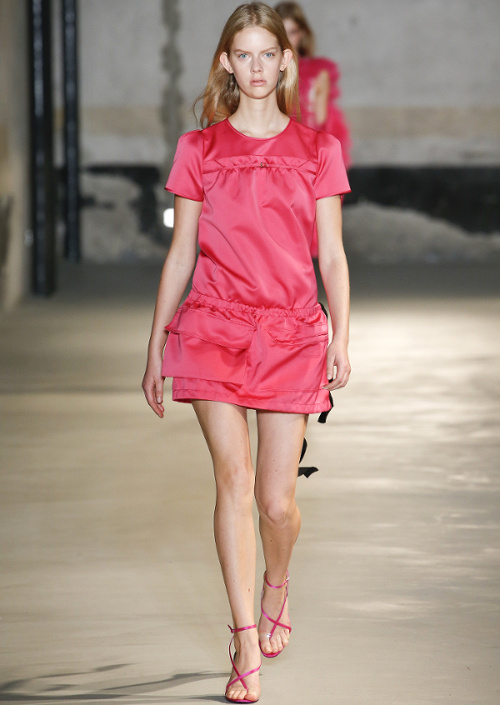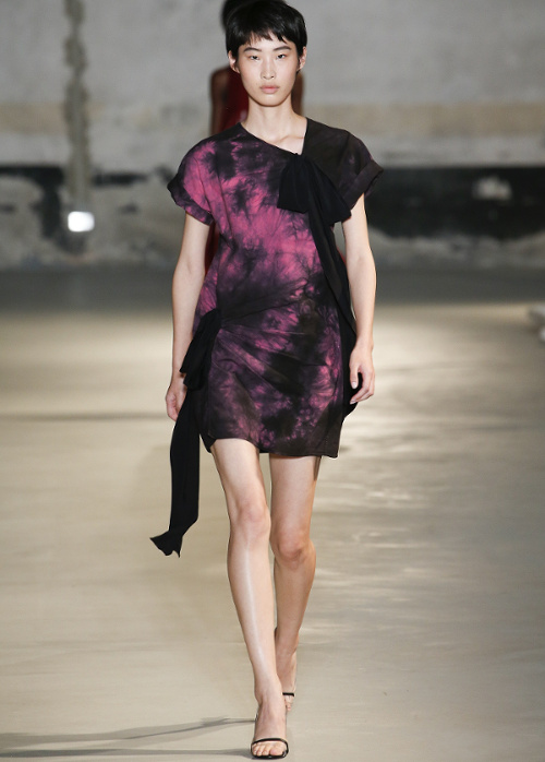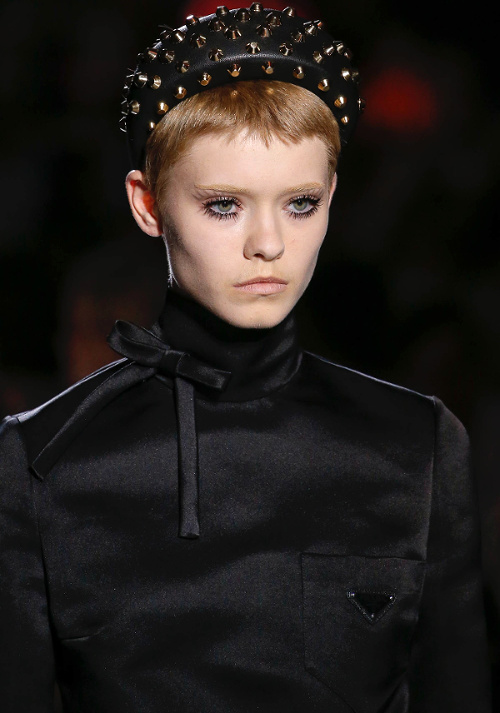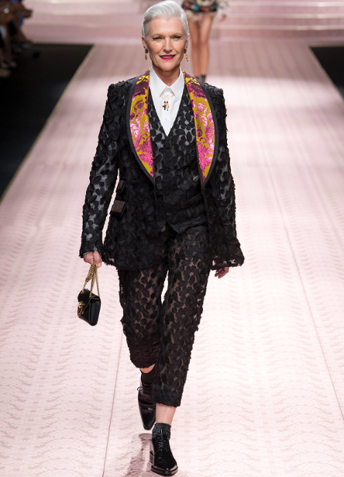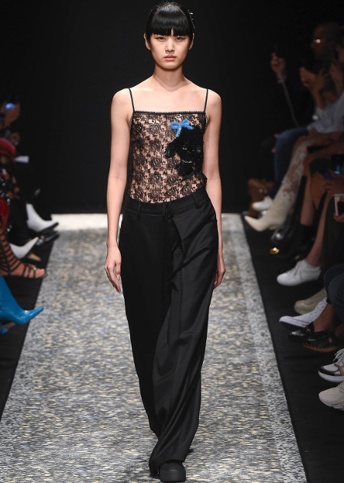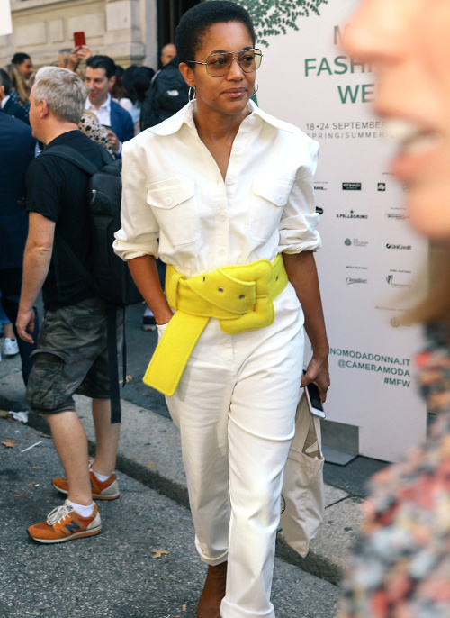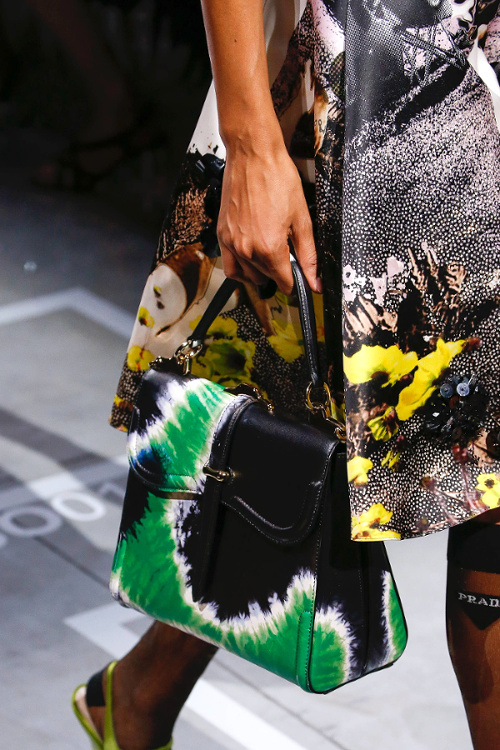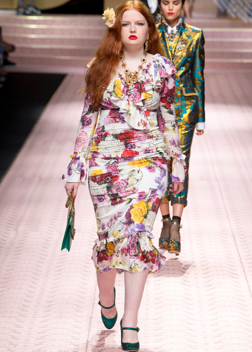 Mariant esthétique sixties et rigueur de l'uniforme, Miuccia Prada livre cette saison un vestiaire cérébral à la fantaisie forcée où la rigidité des matières, l'adoubement du cycliste et les détails sexy-conceptuels tiennent le désir à distance. Si l'on souhaite trouver de quoi activer nos zygomatiques fashion, c'est ainsi du côté des accessoires qu'il faudra - comme souvent chez Prada - jeter un oeil. Le serre-tête à studs esprit auréole machiavélique (voir ici, ici et là), les lunettes papillons à pastilles et les sacs en cuir tie&dye seront en effet à coup sûr des must have… On méditera sur ces quelques phrases livrées en backstage par Miuccia Prada : "What worries me is simplification. Because politics is run by slogans - or not even that, by a hashtag. If you take away content and simplify, at a certain point you can't say anything." Les sublimes pantalons larges de Marco de Vincenzo donnent envie de brûler nos jeans mom (voir ici). Chez Fendi, le short cycliste savoure son statut de "it" pièce et n'hésite pas à faire référence à sa nature utilitaire/sportswear en se portant avec une ceinture pour aventurière urbaine où l'étui à iPhone remplace le baudrier (voir ici et là)... En combinant plissé vaporeux vert lichen, lainage bleu marine et touche de jaune (voir ici), Karl Lagerfeld parvient à rendre le cropped presque chic. Par ailleurs, lorsqu'il utilise un tissu subtilement perforé (qu'il a subtilisé à l'univers sportswear), il contredit avec esprit l'austérité de certaines de ses jupes plissées Fendi (voir ici et là). Via un casting haut en couleur faisant la part belle aux différentes formes de diversité (morphologies, genres, générations et origines), Domenico Dolce et Stefano Gabbana tentent de faire oublier à quel point leurs collections sont redondantes, voire peu seyantes.