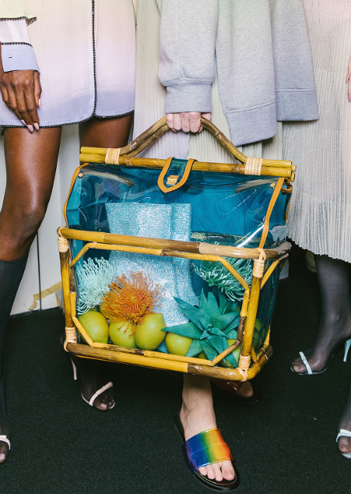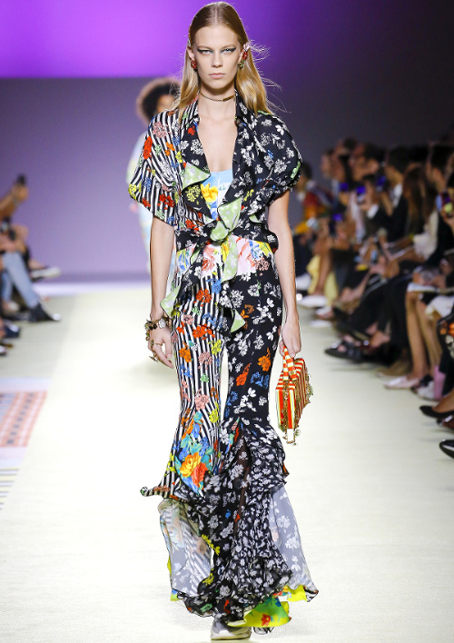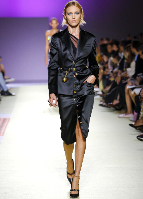 Pour le printemps/été 2019, Donatella Versace livre un show assumant sa schizophrénie chronologique. À l'ère de Pinterest et d'Instagram (où les images se suivent sans ordre apparent), la créatrice n'a ainsi aucun complexe à élaborer un look années 80, un autre évoquant les seventies ou encore une silhouette sixties… On note au passage que le caractère incontournable du satin semble se confirmer. Plus que jamais, la fashion week milanaise misa sur la force hypnotisante et le charme indéniable des femmes de plus de 40 ans. Sûres de leur beauté, riche de leur expérience et fière de leur singularité, ces dernières ont littéralement volé la vedette à leurs jeunes camarades (Amber Valletta chez Agnona, Shalom Harlow chez Versace, Tasha Tilberg chez Etro ou encore Stella Tennant chez Salvatore Ferragamo). Chez Roberto Cavalli, Paul Surridge - nouveau DA de la griffe - essaie de faire oublier les dérives vulgaires de la maison italienne en redéfinissant la notion de sexy. Pour ce faire, il imagine un tailleur où un long blazer cintré vient réchauffer un short cycliste (voir ici, ici et là). Peu convaincant... Chez No21, on salue la sensualité du faux cuir d'autruche, qui n'a rien à envier à la peau véritable (voir ici, ici et là). Et si les toilettes rose stabilo ou tie and dye ne parviennent pas à nous convaincre, les baby dolls taille basse coupées dans un vinyle luisant ne manquent quant à elles pas d'érotisme prêt-à-porter. Le panier de pique-nique (voir ici et là), futur crush fashion ? (Marco de Vincenzo)