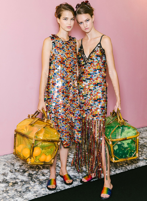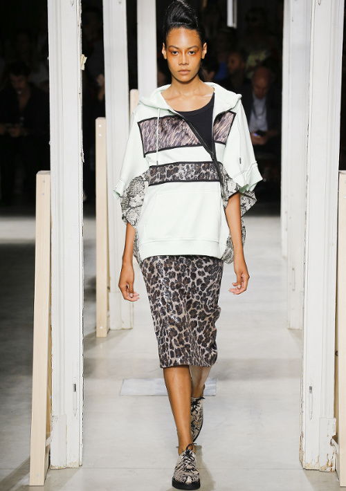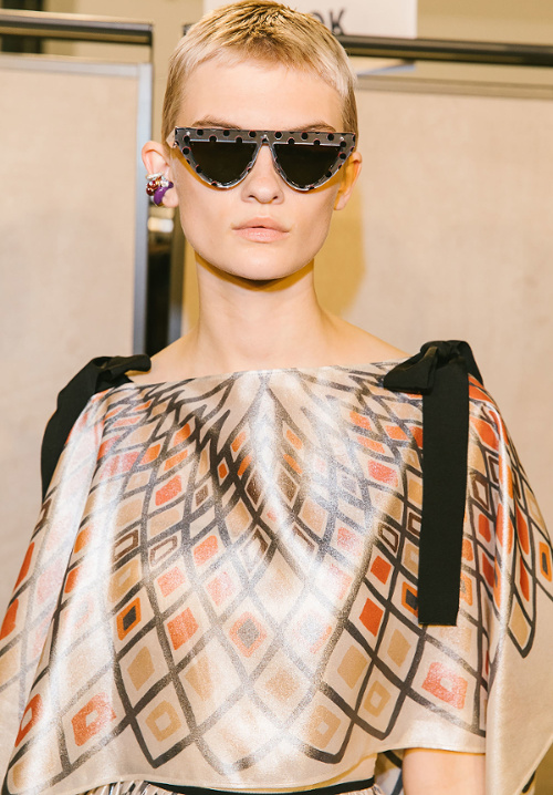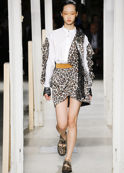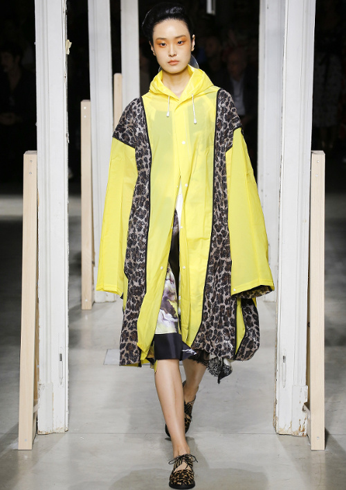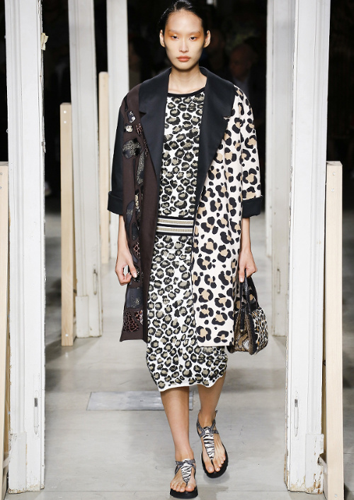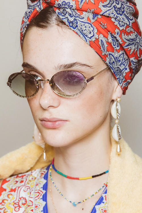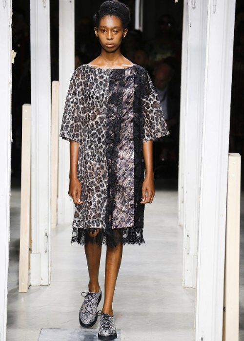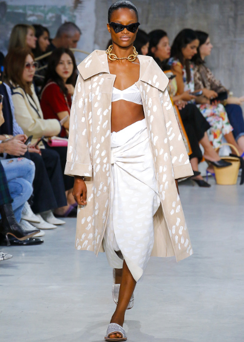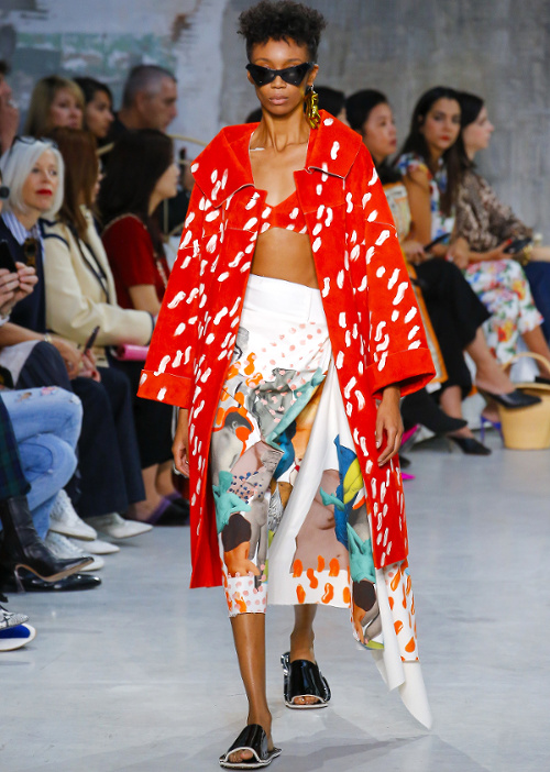 Antonio Marras s'amourache à l'excès de l'imprimé léopard (voir ici, ici, ici, ici et là). De la collection Marni printemps/été 2019, on retiendra les amples manteaux mouchetés de coups de pinceau et au col en trompe-l'oeil (voir ici et là). À l'inverse, on essaiera d'oublier les détails de coupe premier degré confondant citation artistique et hérésie esthétique (voir ici)... En se fournissant en coton bio et équitable au Bénin et en faisant imprimer/broder ce dernier par des ateliers italiens, Stella Jean continue de mettre en valeur la complémentarité des cultures et des savoir-faire. De sa collection, on retiendra cette silhouette fifties à la saveur exotique ainsi que cette robe mariant coupe sobrement élégante et imprimé dépaysant. Giorgio Armani revisite la notion de filet à provisions (voir ici et là). Chez Etro, on assiste à un mariage inattendu entre effluves gipsy et énergie sportswear. Sous les doigts de la créatrice fusionnent ainsi néoprène et tissus bohèmes, donnant naissance à des pièces intéressantes à défaut d'être totalement séduisantes (voir ici et là). On note au passage que les longs manteaux d'été matelassés et les mix turban/boucles d'oreilles coquillages affichent un attrait indéniable. Fendi ose les lunettes de soleil mono sourcil (voir ici)... La notion de maxi ceinture prend une nouvelle dimension (voir ici). Jenny Walton est apparemment très fière de son nombril (voir ici et là)... Certains enfants vont au zoo, d'autres vont voir des défilés (voir ici et là)...