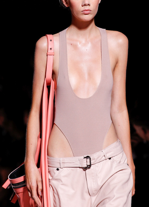 De mixer body lingerie et bas de jogging (voir ici et là). De porter en top à part entière un body entièrement lacé sur le devant (voir ici et là). De croire que le décolleté "goutte" peut être chic (voir ici). De penser que le body 100% lingerie en dentelle blanche peut se porter comme un simple tee-shirt (voir ici). De faire comme si l'échancrure haut sur la cuisse était le nouveau décolleté (Tom Ford).