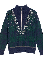 Le pull se porte légèrement dézippé sur la robe. On fait dépasser les manches de la robe de celles du pull. Un pardessus chocolat pourra au besoin réchauffer cet ensemble. La pochette permettra de sophistiquer l'énergie "country" du look.