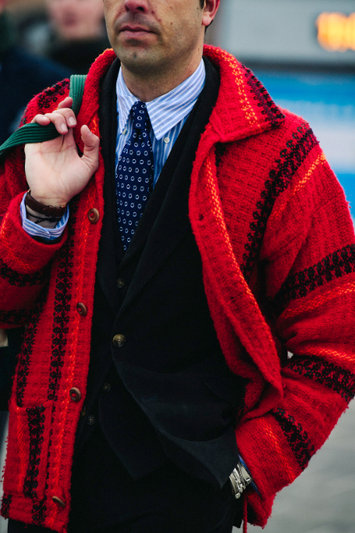 oh, merci pour cet article, Lise. Comme ils sont créatifs ces garçons ! J'aime beaucoup les matières douillettes sur les hommes (pulls mousseux, écharpes rembourrées, vestes en velours) - et les imprimés colorés. Je leur pique les associations costumes + col roulé ou sweat, les lacets colorés dans la capuche des sweats, et les casquettes. J'aurais bien aimé voir leurs pieds, à ces messieurs. Mais la cravate Wall Street, je suis allergique. Je trouve cet accessoire tellement rigide et ridicule !