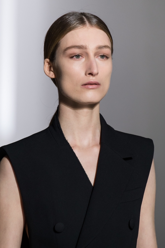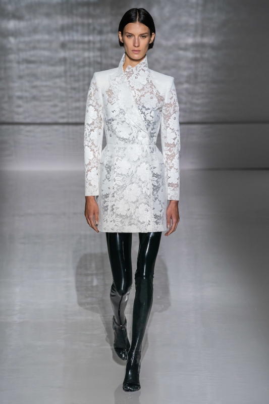 Cette saison, Clare Waight Keller s'attaque à l'essence même de l'ADN de la Haute Couture en mettant la dualité tailleur/flou au coeur de sa collection. Au fil des passages, son amour de l'architecture le dispute ainsi à une légèreté faussement angélique où percent tour à tour des accents cérébraux, modernes ou ouvertement sexy. La rigueur d'une coupe futuro-classique s'adoucit ainsi au contact d'une dentelle rebrodée à la main (voir ici), l'ampleur dramatique d'un jupon évoquant les toilettes du début du 19e siècle se rationalise grâce à un corsage minimaliste à la tonalité sportswear (voir ici), tandis qu'un blazer à basques voit sa sévérité contredite par l'usage d'une dentelle immaculée en lieu et place d'un élégant drap de laine (voir ici). On note par ailleurs la volonté de la créatrice d'émanciper le latex de ses connotations SM. Travaillé comme une seconde peau à part entière, celui-ci semble avoir été conçu spécifiquement pour radicaliser des silhouettes traditionnellement couture. Et si les leggings aux reflets luisants ne servent ici que de faire-valoir à la pièce qu'ils accompagnent (voir ici), force est de constater que l'usage du latex gagne en pertinence lorsque ce dernier forme un corset dégoulinant suavement en fleurettes 3D sur un généreux jupon plissé (voir ici). En dépit de s'inscrire au sein de la semaine de la Haute Couture, Clare Waight Keller n'a pas hésité à présenter un élément prêt-à-porter sous la forme d'un sac à dos hybride, dont l'immense noeud papillon confère une allure d'ange urbain aux belles l'ayant adopté (voir ici et là). Le décolleté nombril a beau se voir ici traité dans un esprit couture, il n'en demeure pas moins une hérésie (voir ici). Le traitement "bords francs" des pièces smoking leur confère une subtile rugosité patinant avec à propos leur chic viscéral (voir ici et là).