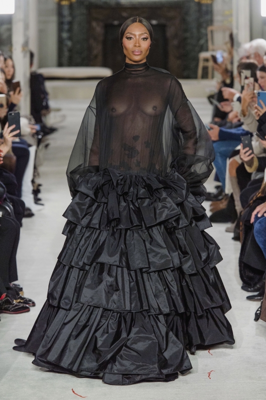 Offrir au passé une nouvelle lecture, s'emparer de l'air du temps afin d'en extraire une vibration positive, s'autoriser le luxe de l'audace et la dextérité de l'excellence : telle pourrait être la charte créative du défilé Valentino Couture de Pierpaolo Piccioli. "What if Cecil Beaton's photograph of those Charles James dresses could be with black women?" s'interroge en effet Pierpaolo Piccioli. Le mood board du créateur télescope ainsi la fameuse photographie de Cecil Beaton immortalisant en 1948 un aréopage d'élégantes femmes blanches en toilettes Charles James (voir ici) avec de multiples images de femmes noires issues aussi bien de magazines seventies que des "Black Issue" du Vogue Italie ou encore de livres d'art représentant des madones noires du moyen-âge. Faisant logiquement la part belle aux femmes de couleur, le casting du show fut un événement à lui seul. Si Pierpaolo Piccioli refuse de proposer une couture contemporaine aux velléités modernistes, ses créations n'en apparaissent pas pour autant déconnectées de la réalité ni fatalement ancrées dans le passé, les monochromes pour robe du soir (ici, ici et là), les harmonies inédites de coloris (voir ici, ici et là), les décolletés aérant les volumes généreux (voir ici et là) et les jeux de transparences (voir ici) permettant aux coupes les plus magistrales d'apparaître parfaitement à leur place au sein d'une collection haute couture de 2019. On note enfin que Céline Dion n'a pu retenir ses larmes lors de certains passages, que Naomi Campbell - qui clôtura le défilé - semble avoir trouvé le secret de l'éternelle jeunesse et que Edward Enninful (rédacteur en chef du Vogue UK) déclara au sujet du défilé : "Possibly the most emotional show I've ever watched".