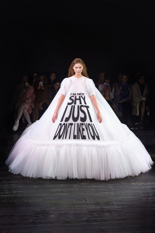 Trublion dans l'âme, le duo qui se cache derrière la griffe Viktor and Rolf s'est amusé cette saison à fusionner de manière potache couture et culture populaire. Les mantras rebelles ponctuant d'ordinaire les tee-shirts des griffes en manque de densité créative migrent ainsi sur des cimaises pour "princesse sous-guccienne" (voir ici), tandis que des inscriptions pour Stories Instagram se patchent sur des trenchs évoquant le travail d'un clone de Simone Rocha et que des textes à la Loïc Prigent s'impriment sur des baby-dolls oversizes dignes de la fête costumée imaginée par Alain Fournier au sein du Grand Meaulnes. Calibrée pour séduire les réseaux sociaux (dont elle fait pourtant tacitement la critique), cette collection - à l'instar de toutes celles du tandem néerlandais - tient au final davantage de la performance artistique que du défilé de mode.