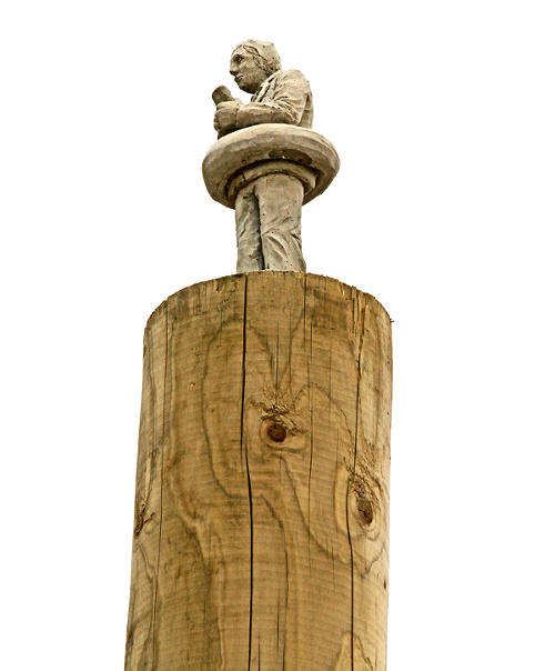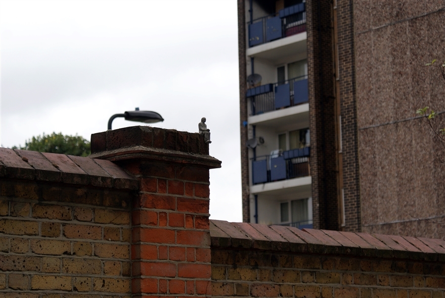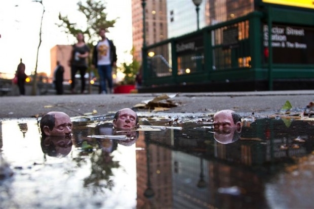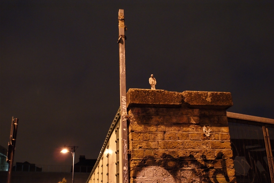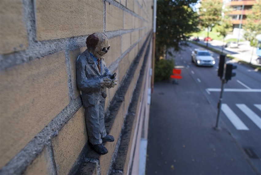 Avec ses micro sculptures - modelées dans l'argile puis coulées dans le béton - qu'il dépose au creux d'une fissure murale, au pied d'une façade décatie ou au sommet d'un Abribus, l'espagnol Isaac Cordal crée des saynètes insolites visant à provoquer chez le passant attentif un questionnement existentiel. Que ce soit via ses figurines de businessmen broyés par la férocité de Wall Street qu'il dissémine au coeur de Manhattan (voir ici, ici et là), celles plus anonymes placées de manière à mettre en abîme l'absurdité de nos vies (voir ici, ici, ici et là) ou ses personnages en costumes 3 pièces attendant la montée des eaux en s'accrochant à leur bouée (voir ici, ici et là), Isaac Cordal manie l'humour noir, la poésie du désespoir et le nomadisme urbain avec une dextérité déconcertante, offrant ainsi à ses convictions politiques une expression bien plus percutante que n'importe quel discours militant.