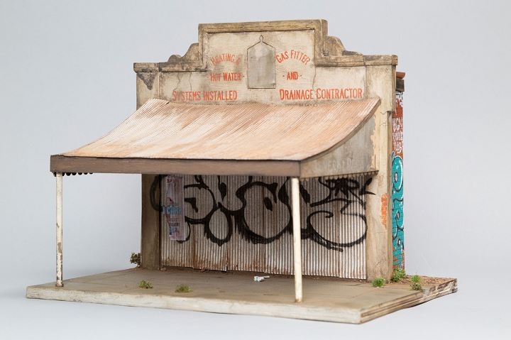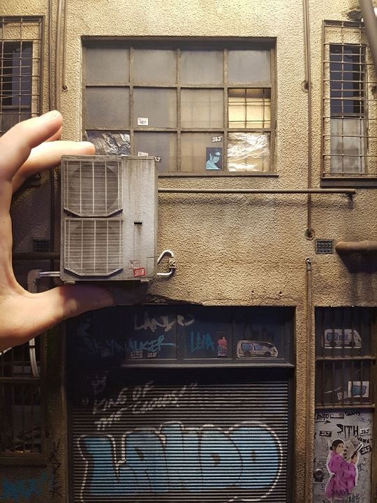 Fasciné depuis son plus jeune âge par le concept de la miniaturisation, Joshua Smith a fait de sa passion d'enfant son champ d'expérimentation artistique. Amoureux inconditionnel des quartiers désenchantés des grandes villes, cet Australien aux allures de skateur passe ainsi son temps à reproduire à échelle réduite ces espaces urbains envahis par les tags, grignotés par le temps et rongés par la rouille (voir ici)... À la vue de ces maquettes ayant nécessité des centaines d'heures de travail, difficile de ne pas être pris de vertige, tant la minutie des détails (voir ici et là), la précision des effets matières (voir ici et là) et la ressemblance affolante avec la réalité (voir ici) dépassent l'entendement. Qu'il choisisse d'immortaliser un immeuble voué à la destruction ou simplement un élément urbain lui évoquant un passé proche et rassurant, Smith parvient à ériger la confection de maquette au rang d'art.