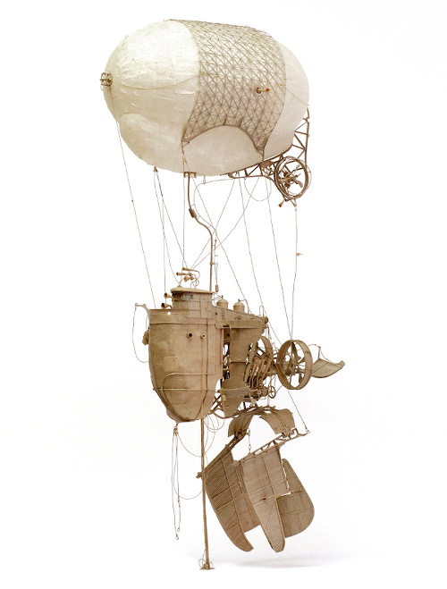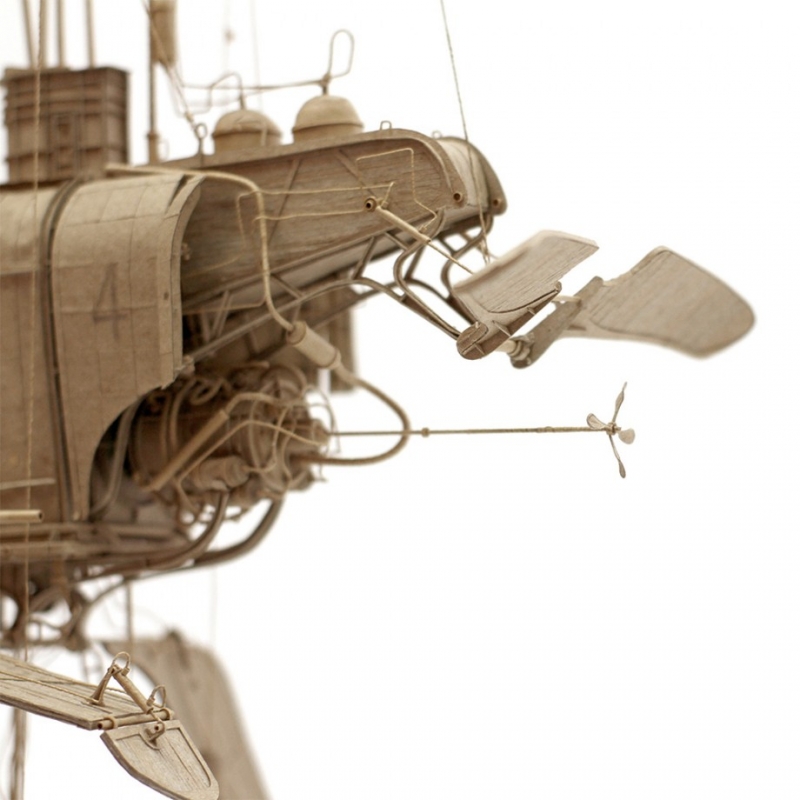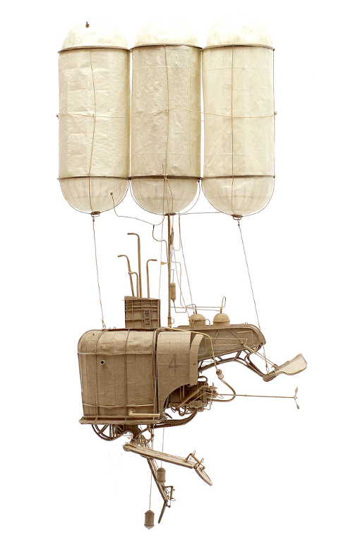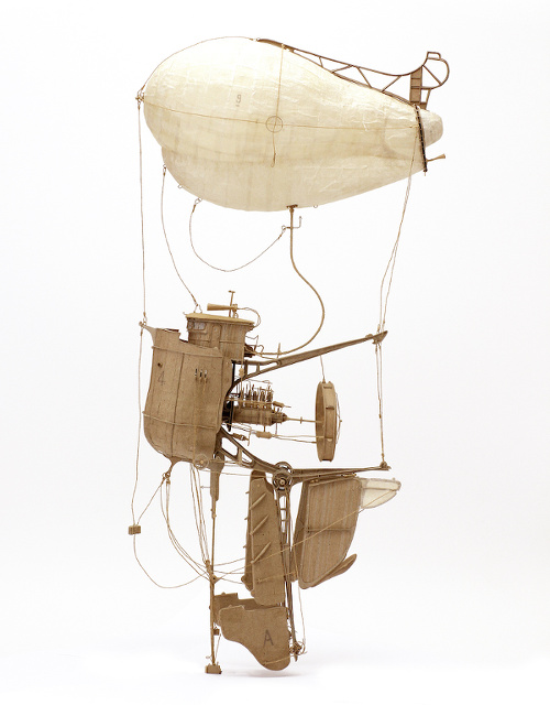 À la vue des machines volantes et autres structures en carton de Daniel Agdag, on se mettrait presque à croire en la réincarnation, tant ces engins à la délicatesse arachnéenne et aux mécanismes complexes (voir ici, ici, ici et là) semblent être l'oeuvre d'un Léonard de Vinci ou d'un Jules Verne. Il est vrai que ce qu'il nomme humblement "sketching with cardboard" mêle le perfectionnisme joyeux du Toscan à l'imagination scientifique débridée de l'auteur de "Voyage au centre de la Terre ". Ajoutez à cela une capacité hors du commun à créer en 3D ex nihilo (Daniel Agdag ne fait qu'aucun croquis préliminaire, il élabore ses vaisseaux aériens au fil de son inspiration) et vous obtiendrez un démiurge aux créations tim burtoniennes dont la délicatesse brute transporte immédiatement l'esprit au sein d'univers régenté par un savant délicieusement fou.