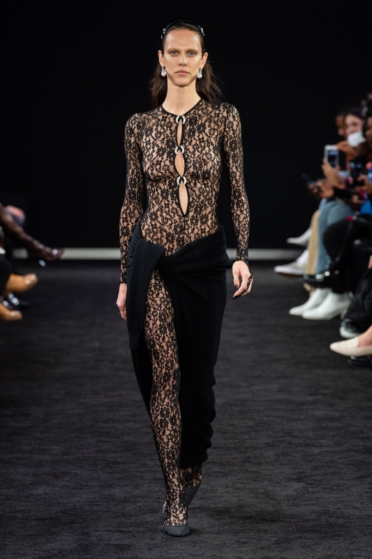 A demi allongé sur l'un des immenses canapés d'un loft new-yorkais où déambulent des corps nus dans une ambiance post-orgie, Alexander Wang aperçoit une fille - plus frileuse que ses camarades - nouant un long gilet sombre autour de sa taille. L'effet cosy/sensuel de ce mix maille/peau interpelle le créateur. Le lendemain, au studio : "Si je remplace la nudité de cette fille par une combinaison en dentelle translucide et si je travaille un long pan de maille en mode paréo, je pourrais bien parvenir à transformer ma vision d'hier soir en silhouette phare de ma future collection" (voir ici et là).