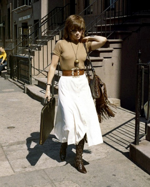 Merci Lise, tu nous confirmes que les années 70 américaines sont extraordinaires pour le "casual chic", pour cette espèce de désinvolture sportive et élégante, chez les filles comme chez les garçons (je ne me remets toujours pas du panorama Ford-Redford-Newman-McQueen de la dernière fois). Rien que le premier look, on tombe à la renverse tellement c'est simple, efficace et bien porté.