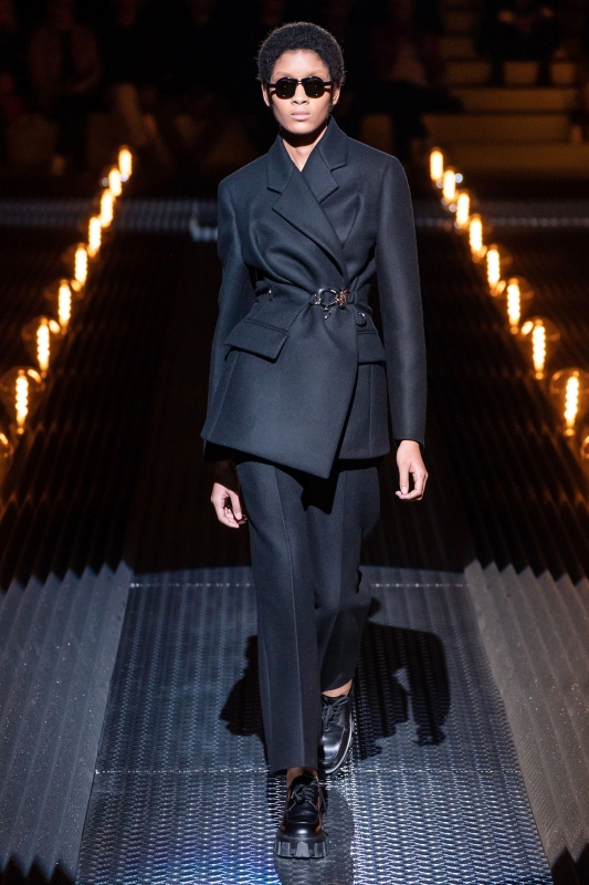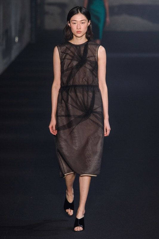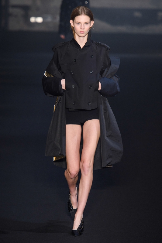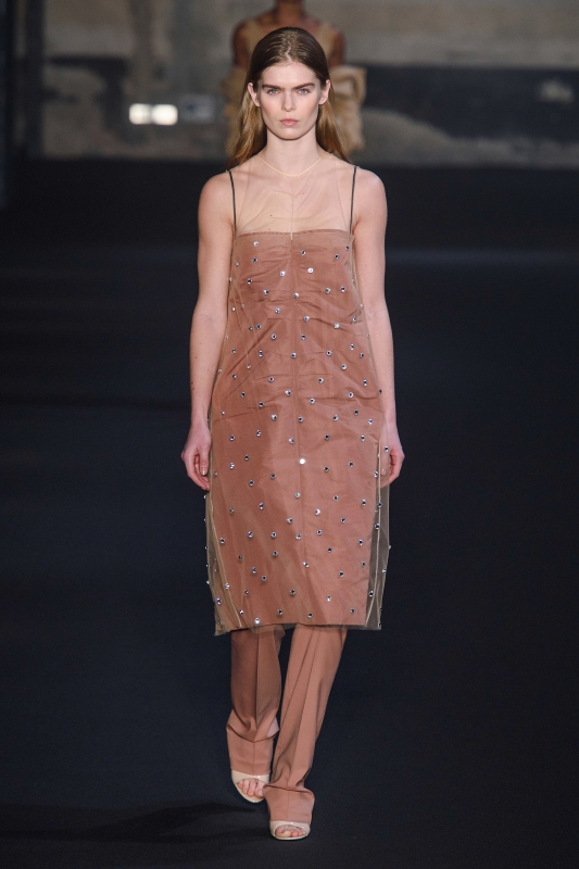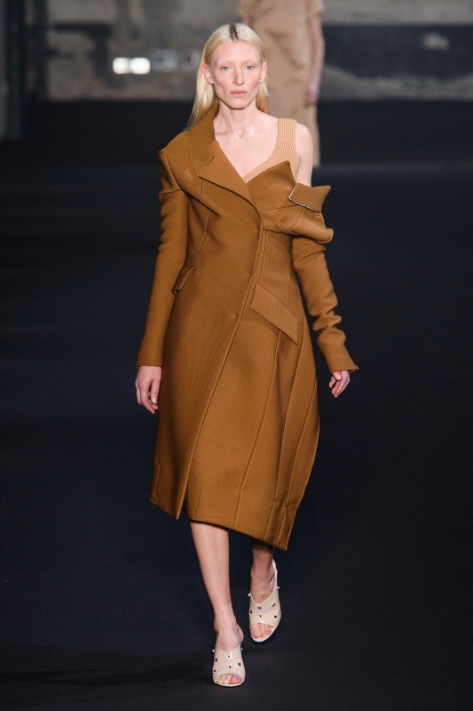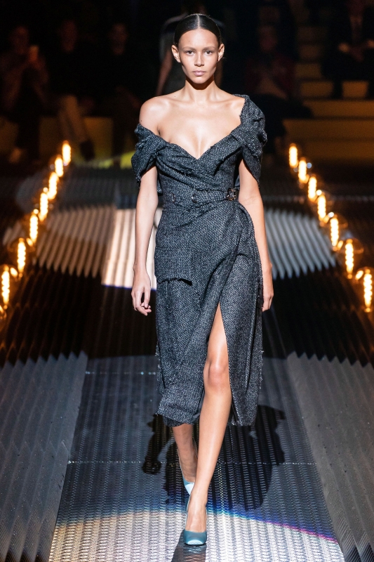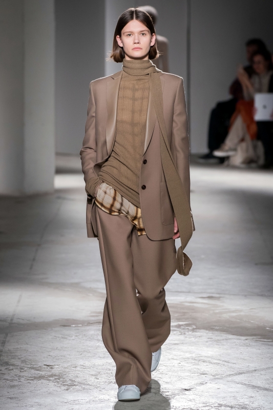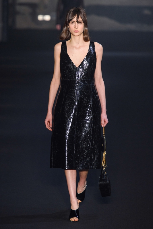 Le show Fendi se déroulant quelques jours à peine après le décès de Karl Lagerfeld, il était évident que celui-ci serait chargé d'une émotion toute particulière. C'est ainsi qu'Anna Wintour assista au défilé non pas en front row, mais en backstage aux côtés de Silvia Venturini Fendi et que fut projeté lors du salut final un extrait du documentaire de Loïc Prigent "Karl Lagerfeld se dessine" lors duquel la voix unique du Kaiser résonna une dernière fois. La créatrice révéla par ailleurs n'avoir gardé pour le show "Que les pièces sur lesquelles il avait travaillé. Pas question de faire des interprétations de son travail.". Parmi les différents passages de cet ultime défilé Lagerfeldien, on retiendra l'usage de la fameuse résille de cuir inventée par le Kaiser lui-même (voir ici), la silhouette androgyne pardessus/pantalon large joliment twistée par la moue souriante de Lindsey Wixson (voir ici), l'alliance entre teinte chamois, jaune bouton d'or et gris ultra light (voir ici) ainsi que le look mêlant douceur, rigueur et féminité (voir ici). Imaginer le vestiaire de la femme post "me too" semble avoir donné des sueurs froides à Alessandro Dell'Acqua. Zipper ou dézipper (voir ici) ? Dévoiler ou non les jambes sous une robe longueur genoux (voir ici) ? Simuler ou non les transparences d'une chaste robe col rond (voir ici) ? Se rebeller et prôner (ou pas) le port de la culotte en tant que short à part entière (voir ici) ? Gommer ou non les courbes sous des robes légèrement trop grandes (voir ici) ? Telles sont apparemment les questionnements ayant donné naissance à cette collection manquant cruellement d'intérêt...