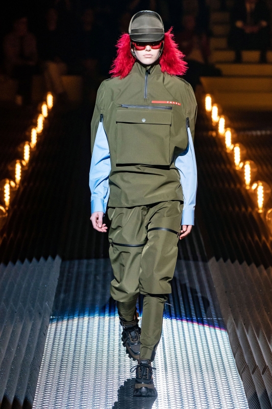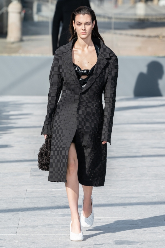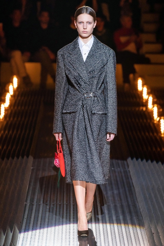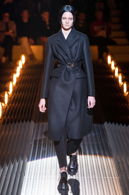 Révoltée par les conflits internationaux mais néanmoins déterminée à affirmer sa sensualité cérébrale, la femme Prada se crée une garde-robe empruntant aussi bien à la rigueur militaire et à la noirceur d'un essai apocalyptique qu'au romantisme premier degré d'une brassée de tulipes. Mercredi Addams dans l'âme, elle assume ainsi un style fleurant bon l'exaspération et la rébellion puérile. On retiendra l'allure insolente de ses manteaux masculins et autres vestes cintrées au moyen d'un mousqueton (voir ici, ici et là), le glamour égratigné de cette robe en tweed esprit Vivienne Westwood ou encore l'utilisation du bleu ciel pour réveiller les teintes organiques (voir ici et là). L'accessoire pradien de saison est incontestablement cette paire de rangers pour citadine survivaliste (voir ici). Alors que l'on espérait que Daniel Lee - ex de chez Céline - apporterait au sein de sa première collection Bottega Veneta un peu du minimalisme bourgeois subliment décalé qui fit le succès de Phoebe Philo, le jeune homme livra un opus surchargé, poussif et parfois même maladroit (voir ici, ici et là). Seule la silhouette évoquant une guerrière japonaise en perdition au sein du 21e siècle (voir ici) parvint à faire honneur aussi bien au savoir-faire de la griffe qu'à l'ADN sportswear chic et désinvolte du créateur. À suivre...