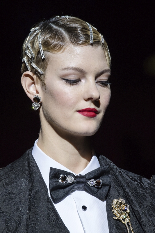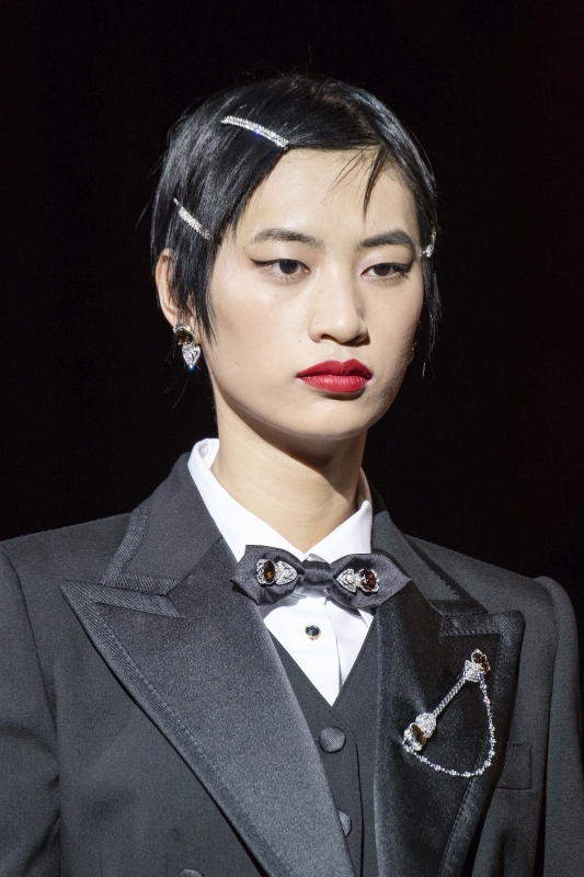 Chez Missoni, capuche et tchador fusionnent et brouillent les pistes (voir ici et là). Simon Holloway (Agnona) mêle avec brio tailoring et carreaux grungy (voir ici). Chez Moncler, Pierpaolo Piccioli offre - littéralement - au nylon rembourré ses lettres de noblesse en imaginant des toilettes pour duchesse frigorifiée (voir ici et là). Le gimmick des multiples barrettes plates bijoutées ne semble pas vouloir battre en retraite (voir ici et là).