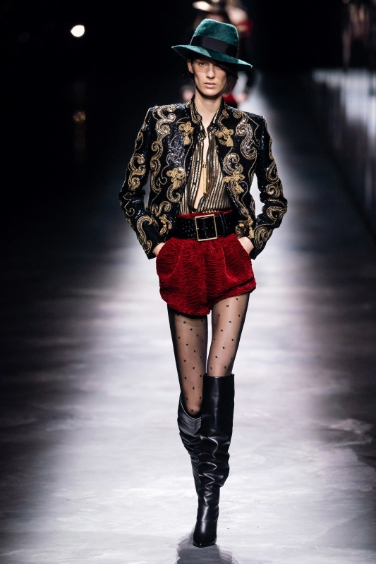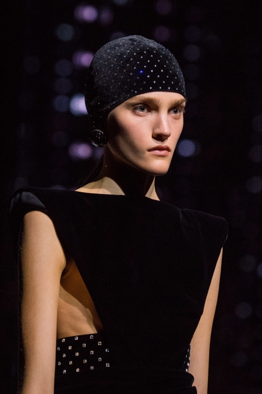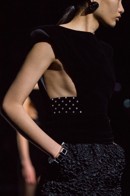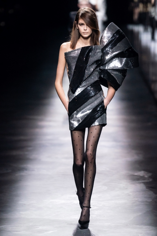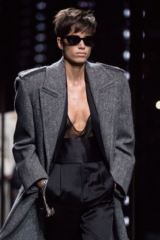 Cette saison, Anthony Vaccarello élargit son horizon en accompagnant ses jupes et robes lilliputiennes de manteaux et vestes à la carrure "Wall Street 80's" (voir ici et là). Et si cette digression vers une approche plus tailoring de l'univers Saint Laurent est bienvenue sur le papier, ses créations épaulées n'en apparaissent pas moins aussi déconnectées de la réalité que les micro jupes des filles Saint Laurent. Qui en effet ressent aujourd'hui le besoin d'arborer une carrure de footballeur américain pour se sentir forte ? Quelle est cette pensée passéiste consistant à dire que les femmes ont besoin d'emprunter aux hommes certains de leurs attributs pour affirmer leur détermination ? Alors certes, l'hommage à la silhouette de Betty Catroux est sympathique (et les carrures seront certainement rabotées afin de correspondre aux normes du prêt-à-porter), mais force est de constater qu'Anthony Vaccarello a du mal à trouver le curseur entre "over-sexyness" et clichés eighties (voire clichés tout court). Sans parler de cette impression d'irréalité quasi malsaine générée par la présence de modèles rachitiques - voir ici, ici, ici et là - faisant passer la minceur de leurs collègues pour un surpoids contrôlé.