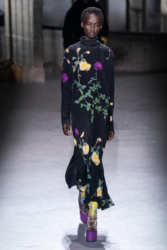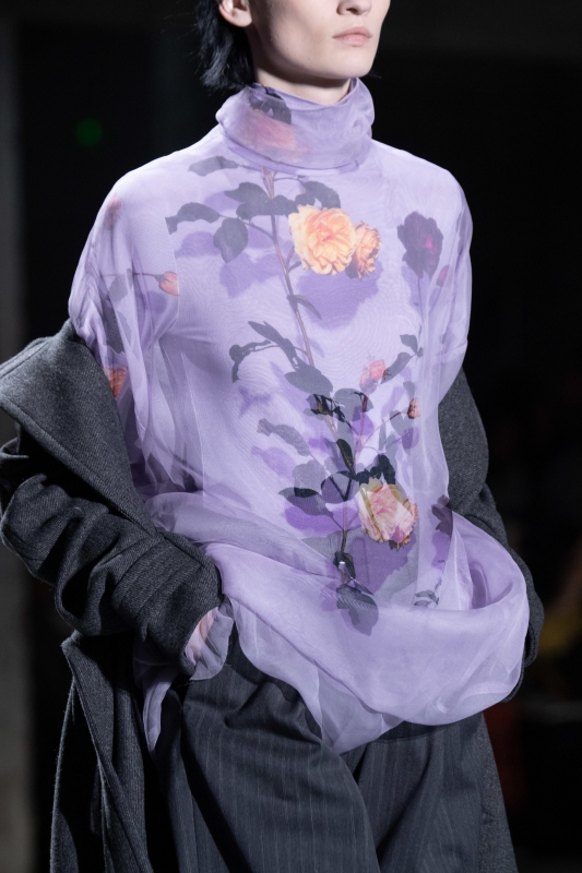 Horticulteur passionné, Dries Van Noten cultive avec amour les nombreuses variétés de roses parsemant son jardin belge. Des fleurs qu'il met à l'honneur cette saison non pas dans leur magnificence, mais plutôt dans leur fragilité constituée de défauts et de flétrissures, l'idée étant de faire un parallèle entre l'imperfection de ses roses et celle de la nature humaine. Malheureusement, si le concept est enthousiasmant, sa réalisation ne l'est pas totalement.