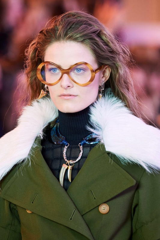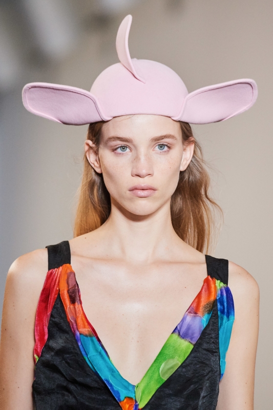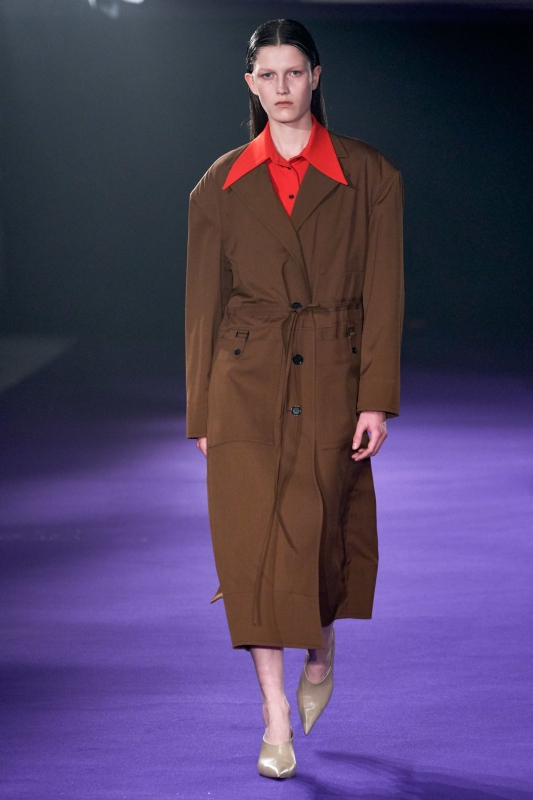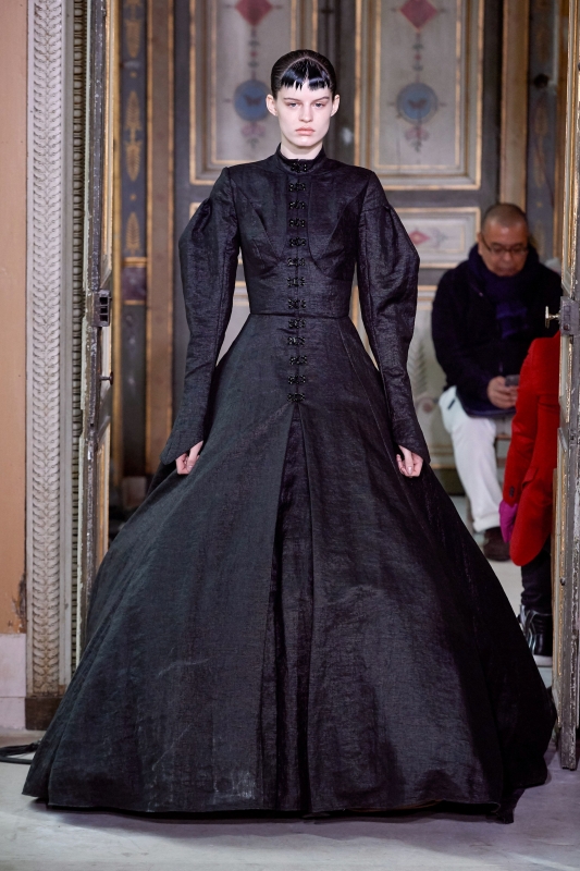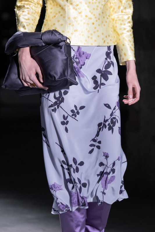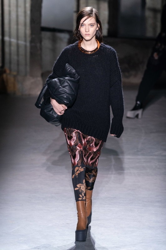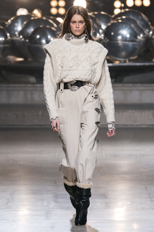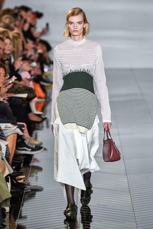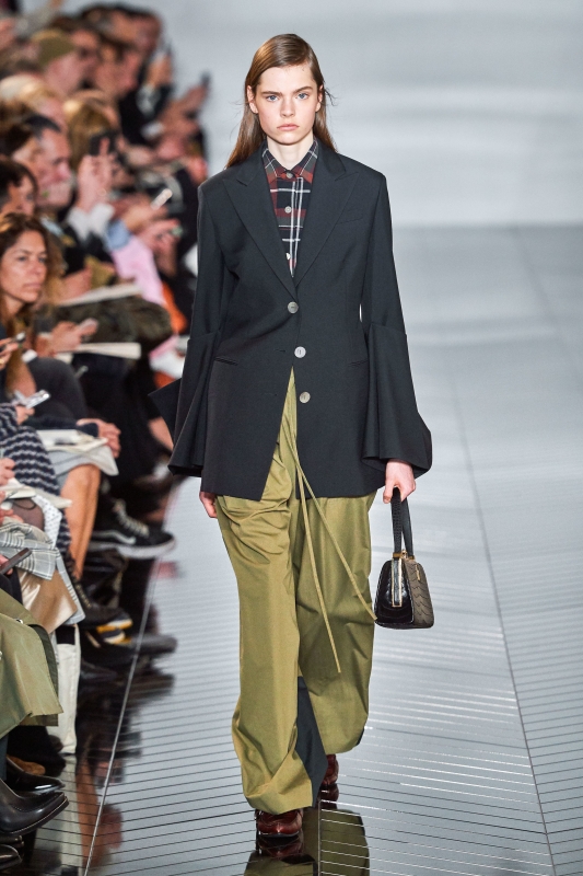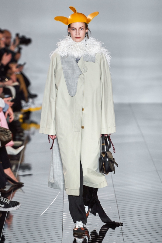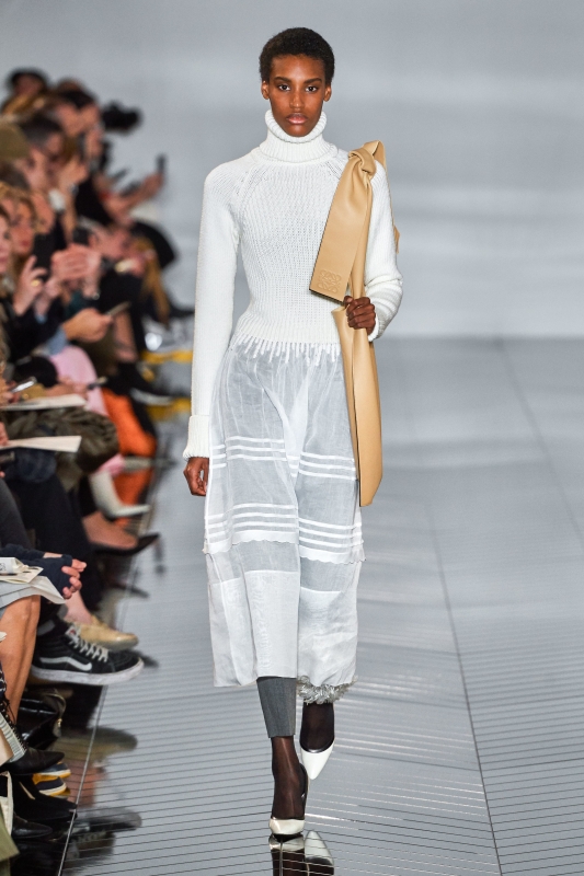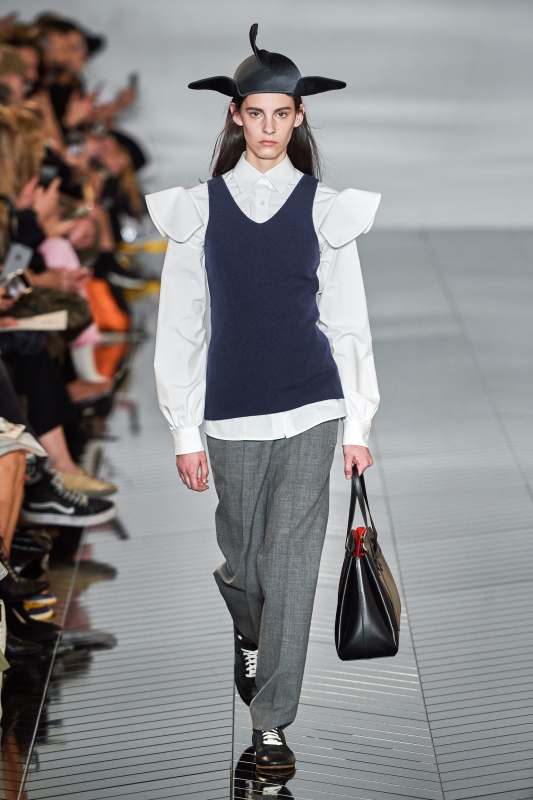 Considéré par certains comme le fils spirituel de Phoebe Philo, J.W. Anderson fait flotter sur le vestiaire Loewe automne/hiver 2019-2020 des effluves 17e siècle qu'il conjugue dans un esprit artisanal baigné de sportswear. Une collection dotée de pièces fortes dont l'allure puissante ne manquera pas de séduire les trendsetteuses cérébrales avides de fantaisie. On pense notamment à cette cape dont la laine douillette attendrit la dégaine historique, à cette chemise aux épaulettes en popeline évoquant les éléments d'une armure, aux mailles grignotant des jupons (voir ici et là) ou encore aux manteaux aux cols arrondis asymétriques (voir ici). Sans parler du duo pull-over perlé/baggy (qui risque d'affoler aussi bien les acheteurs que les rédactrices de mode) ou encore des silhouettes renouvelant avec brio les mix classiques pardessus camel/pantalon bleu marine/baskets blanches et blazer bleu marine/chino kaki.