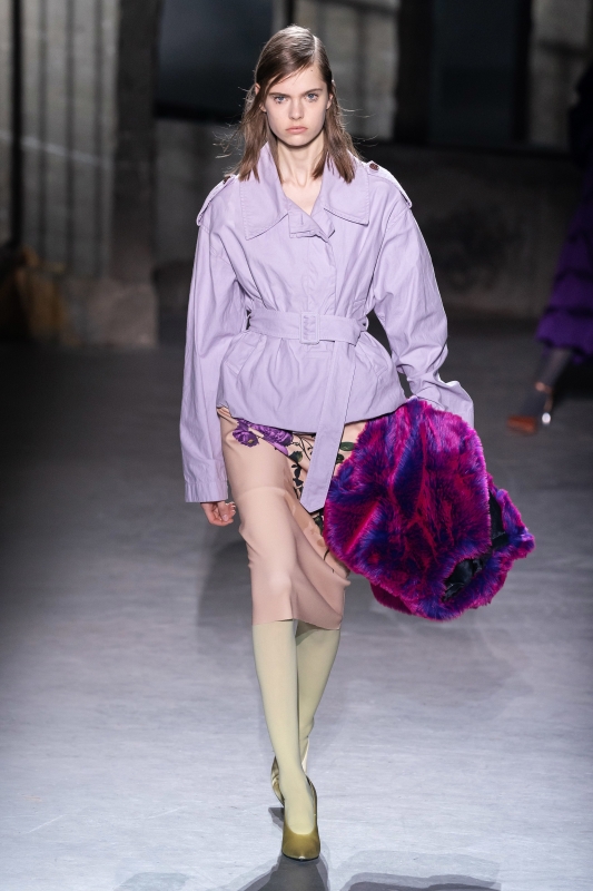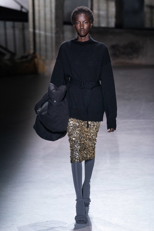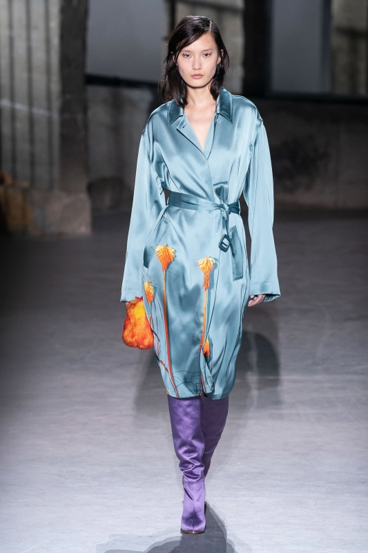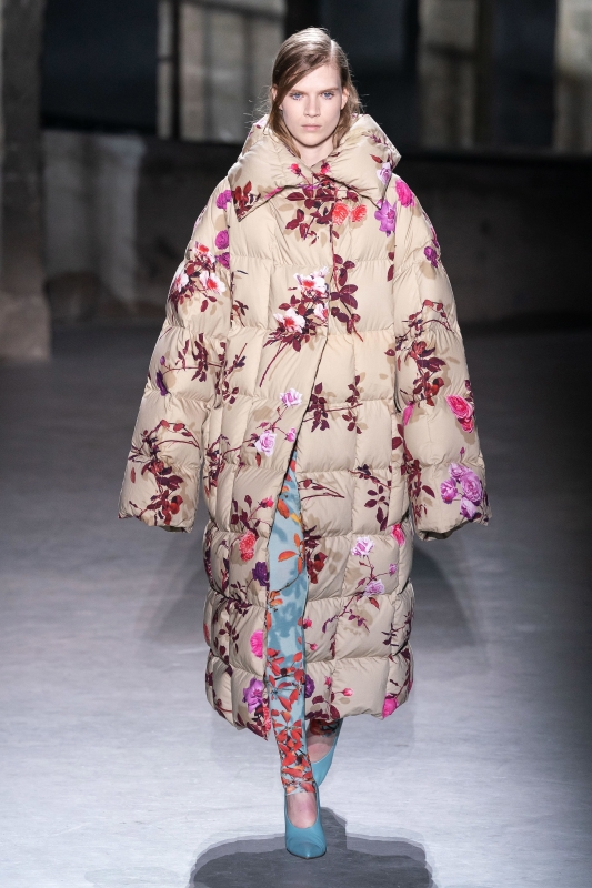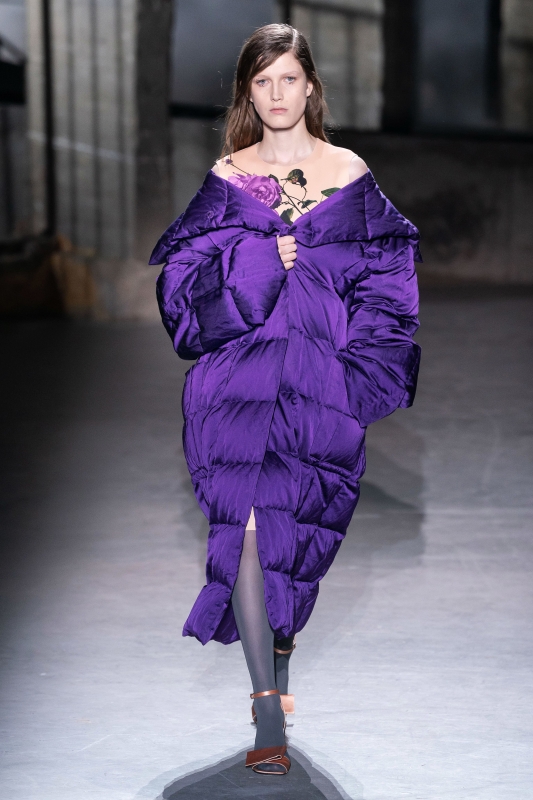Cela étant dit, si l'on fait abstraction de cette poignée de pièces où le commercial l'emporte sur la poésie, force est de reconnaître qu'entre l'aura masculin/féminin du style Van Noten (voir ici et là), l'audace adoucie de certains alliages de teintes (voir ici, ici et là), les lignes années 40, le mariage entre ample pull mousseux et jupe sophistiquée (voir ici et là) ainsi que le traitement Paul Poiret des longues doudounes (voir ici et là), Dries Van Noten reste un pourvoyeur d'intemporalité suave.