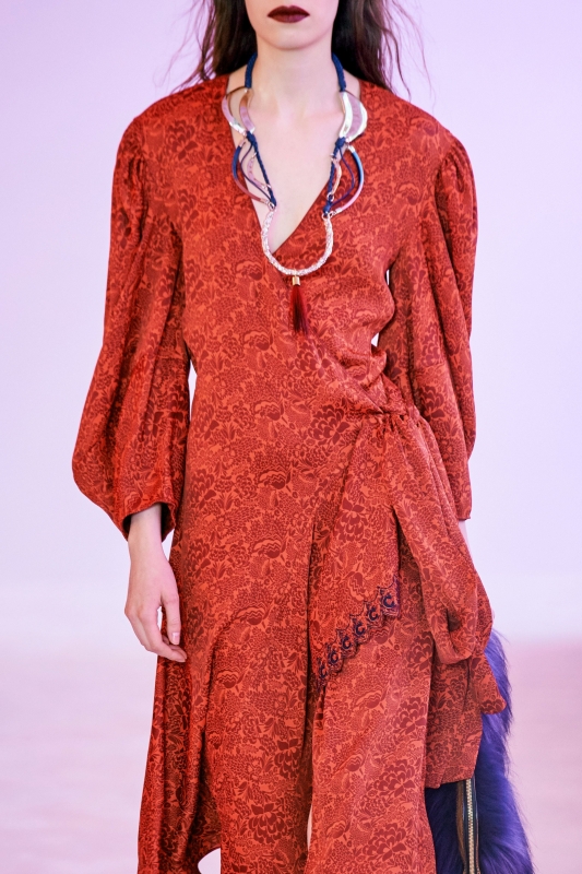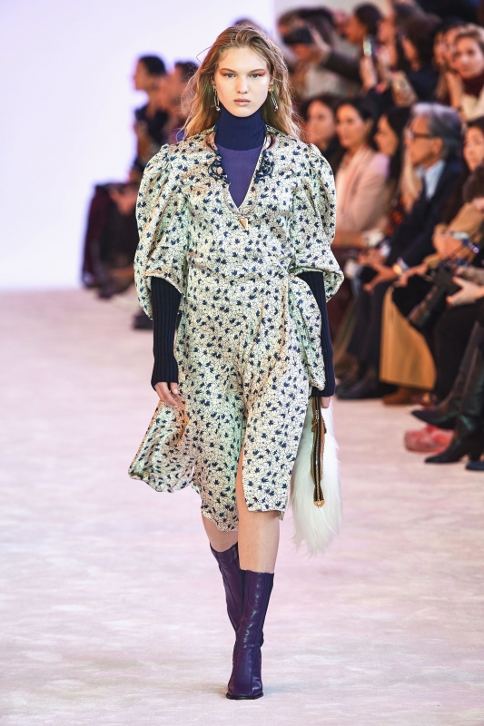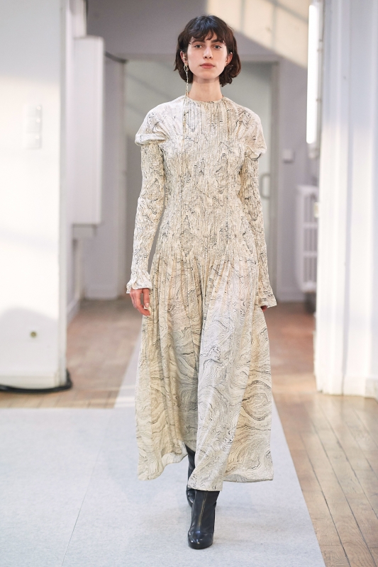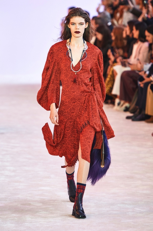 Du show Chloé, on retiendra avant tout les robes imaginées par Natacha Ramsay, dont l'ADN seventies remastérisé fait mouche. Souvent asymétriques et parfois brodées de discrets "C", ces modèles portefeuille aux manches tantôt bouffantes tantôt étroites exhalent en effet une féminité légèrement alambiquée non dénuée de charme.
