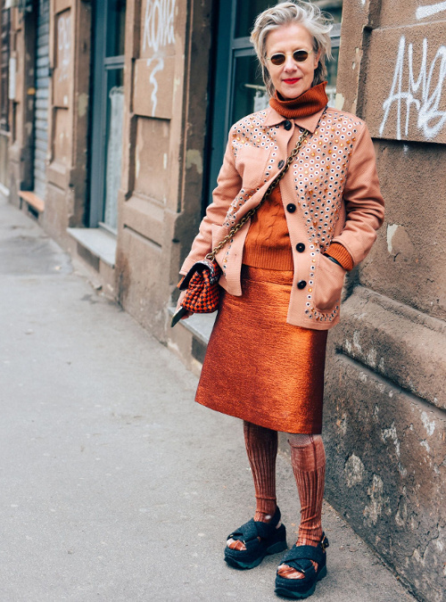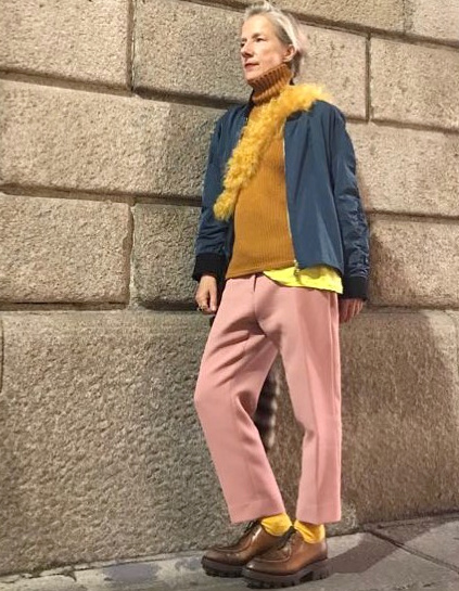 Bettina Oldenburg a le chic pour associer les couleurs mais ses looks sont quand même assez improbables (surtout les chaussettes mi-mollets qui piquent un peu les yeux)