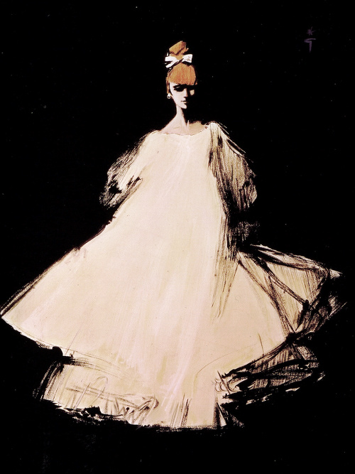 Véritable touche de lumière au sein d'une réunion de happy few que l'on imagine soporifique, la toilette tout en volume de cette ballerine mondaine fascine tant par par sa légèreté paradoxale (au vu du métrage de tissu supposément utilisé) que par son ampleur évoquant les créations de Simone Rocha. Cette silhouette tracée par René Gruau nous offre par ailleurs une leçon de mode universelle, qui consiste à équilibrer une tenue volumineuse en dégageant généreusement la base du cou et en misant sur une coiffure mettant en valeur le visage afin de créer un ensemble harmonieux. J'aime enfin le fait que cette jeune femme que l'on imagine menue, presque frêle, parvienne à conquérir l'espace grâce son audacieux choix vestimentaire. Comme si la mode au sens noble du terme lui permettait de prendre le pouvoir…