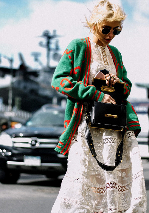 Marier des éléments issus de champs stylistiques différents est devenu ces dernières saisons un modus operandi presque classique. On ne compte ainsi plus les associations télescopant blazer british et nuisette satinée ou encore veste de jogging et blouse victorienne. Cela dit, aussi photogéniques soient ces dernières, c'est à mes yeux le duo robe romantique/épais gilet de grand-père qui magnifie le plus cette grammaire des opposés. À l'instar du mix and match lainage Gucci néo-ringard/longue robe en dentelle immaculée, ce type de tandem brille en effet par sa capacité à sublimer le confort et à patiner la dimension souvent premier degré des étoffes fleur bleue. Alors que je laisse flotter mon regard sur ce look street-style, je me dis qu'au lieu d'aller me réfugier les jours de flemme fashion au creux du look jean boyfriend/chemise/trench, je ferais mieux de me procurer au plus vite de quoi me composer ce genre de duo…