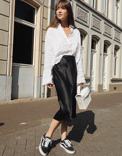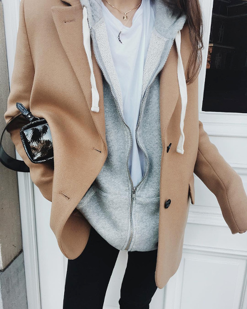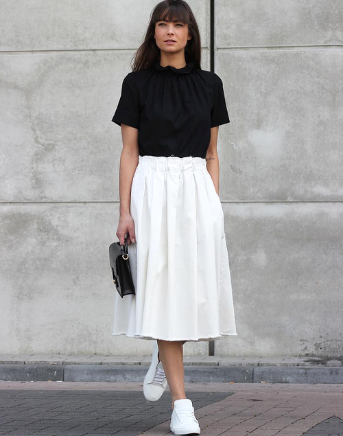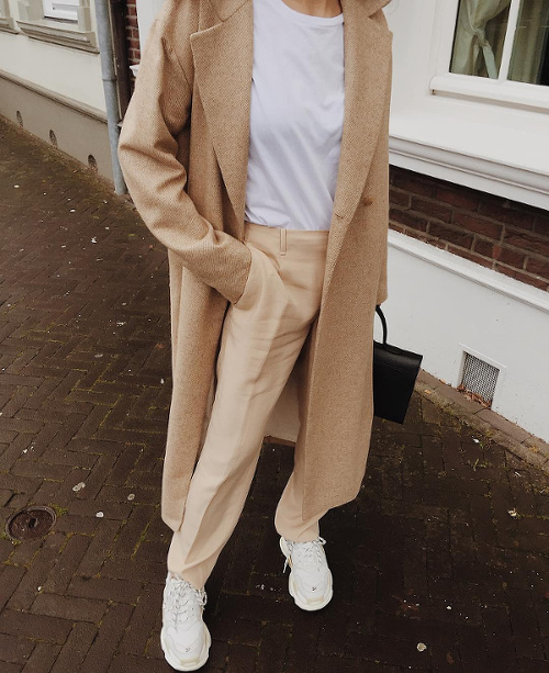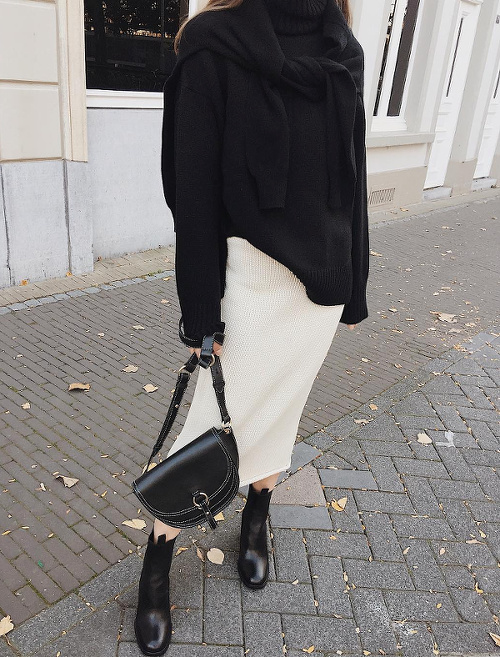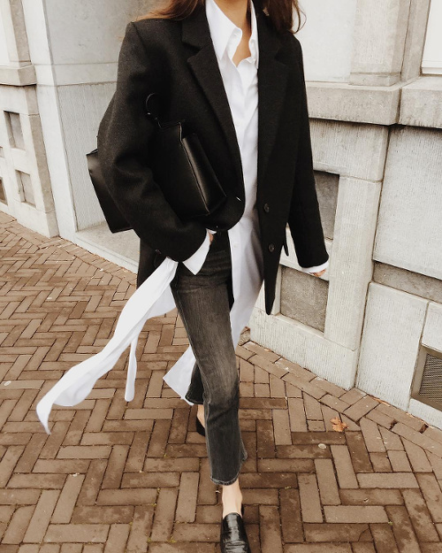 Faire des associations beige/blanc un incessant terrain d'expérimentation (voir ici, ici, ici et là). Troquer son perfecto noir contre un trench en cuir carbone (voir ici). Moderniser le tandem blanc/beige en lui adjoignant une paire de massives baskets immaculées (voir ici). Créer une subtile harmonie entre la féminité d'une jupe mi-longue imprimée et l'urbanité plus brute de divers éléments noirs (voir ici). Twister un look classique en optant pour une robe chemise en guise de chemise blanche (voir ici). Adoucir la rigueur d'un manteau droit en y glissant un sweat zippé à capuche légèrement trop grand (voir ici). Maîtriser le volume oversize d'un manteau en dévoilant une cheville nue (voir ici et là). Réchauffer ses jupes tubes midi grâce à un pull ample à demi glissé sur le devant de la jupe (voir ici). S'amuser avec le concept du look noir et blanc (voir ici, ici, ici, ici et là).