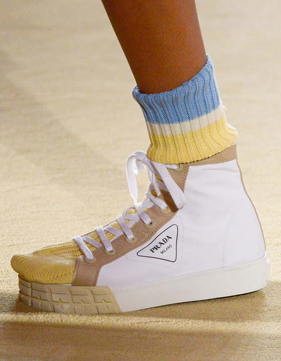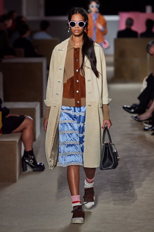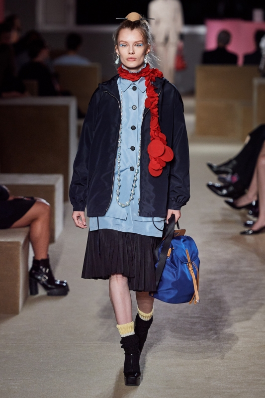 Le pardessus bleu marine se révèle être une bonne alternative à son homologue camel. On retiendra l'idée de le porter avec une paire de néo perles sauvages et de baskets agrémentées d'une pointe de marron (voir ici). Si on l'on n'est pas forcément convaincu par le nouveau mix and match de longueurs imaginé par Miuccia Prada, le duo beige/bleu ciel de ces tenues nous donne néanmoins envie de marier plus souvent ces deux teintes (voir ici et là). Broder ses blouses blanches risque fort d'être la prochaine activité DIY plébiscitée par les trendsetteuses en quête d'authenticité trendy (voir ici). Une fois apaisés au contact d'un chaleureux cuir suédé cognac, les reflets potentiellement cheap d'un satin azur gagnent en portabilité (voir ici). Le bonnet rayé gagne en fantaisie en doublant ses rayures de pastilles ton sur ton (voir ici). Ceinturer taille haute une chemise à rayures pyjama permet de la porter avec un short rayé sans avoir l'air d'être tombée de son lit (voir ici). En s'essayant aux cadavres exquis d'imprimés, Miuccia Prada nous rappelle que pour que ces derniers fonctionnent, préserver une certaine harmonie de teintes et laisser apparaître quelques larges parcelles de peau nue est souvent nécessaire (voir ici). Déboutonnées sur le bas, les chemises liquettes forment avec les jupes 7/8 une silhouette dont les proportions demandent à être apprivoisées (voir ici).