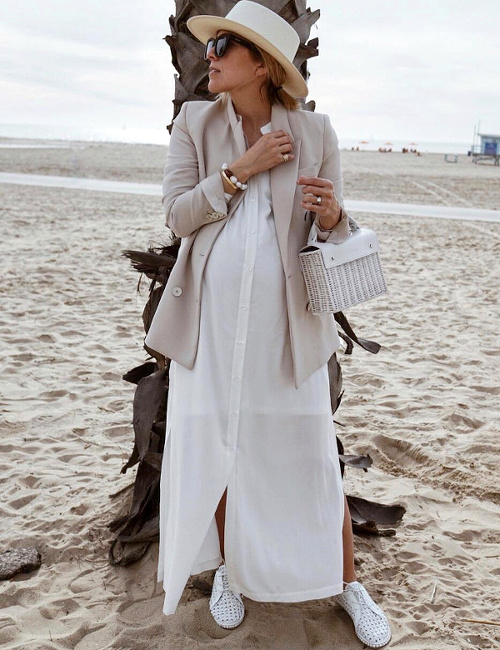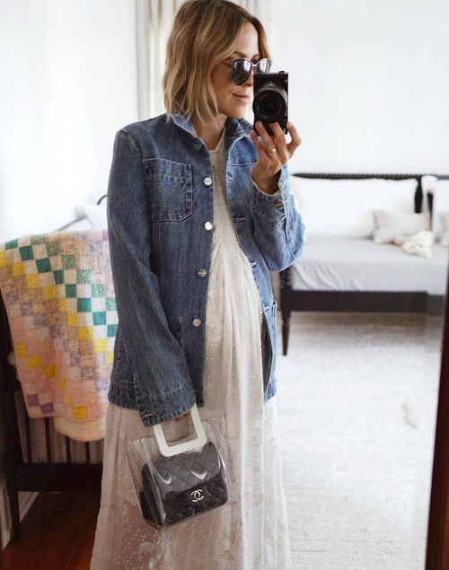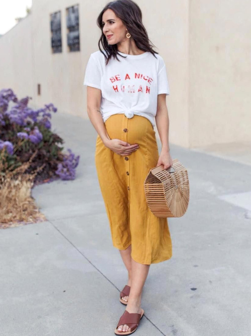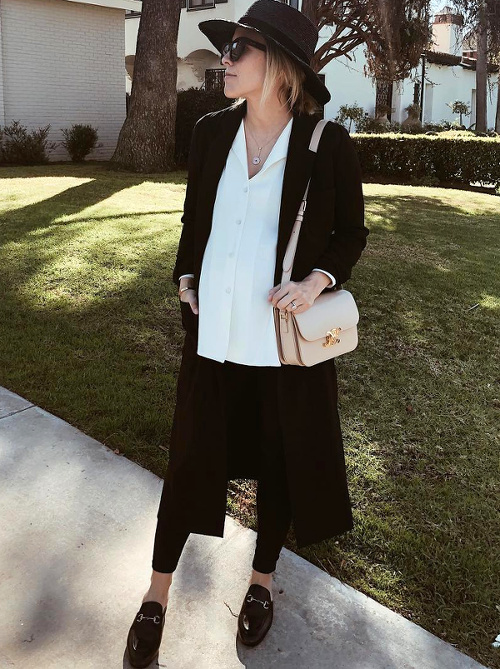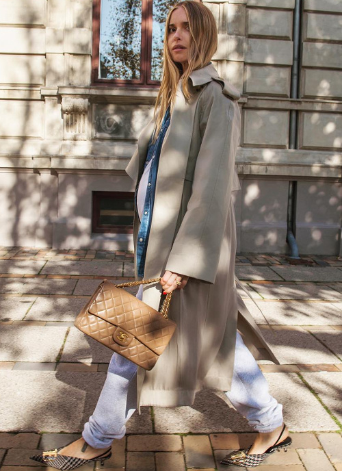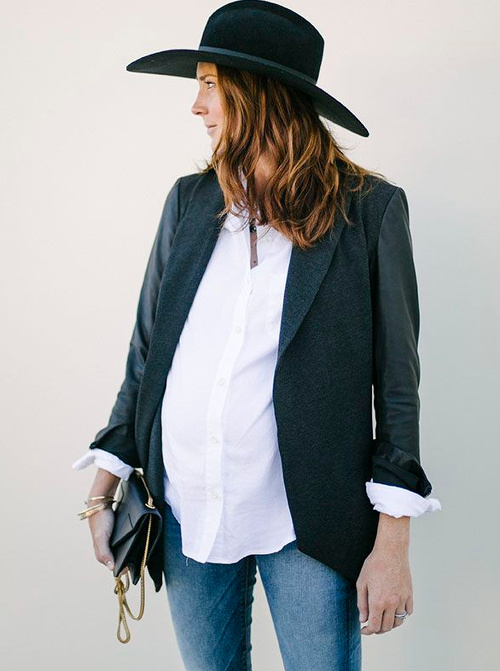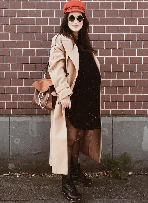 Twister la dimension "comfy/roots" de la chemise de bûcheron oversize en lui associant une paire de mules sophistiquées (voir ici). Marier robe patineuse bleu marine et ample veste kaki (voir ici). User et abuser du combo trench long/petite robe noire/Doc Martens (voir ici). Insuffler caractère et cosyness à ses combi-pantalons monochromes en les réchauffant au creux d'un long et épais gilet (voir ici). Rockabiliser ses pièces les plus basiques en leur associant un perfecto en cuir noir (voir ici). Miser sur un fedora à bords longs pour équilibrer la silhouette (voir ici). Alléger le trio robe longue/sandales plates/baby bump en optant pour un modèle fendu dévoilant la jambe (voir ici). Recycler ses longues jupes en jupes midi taille haute (voir ici).