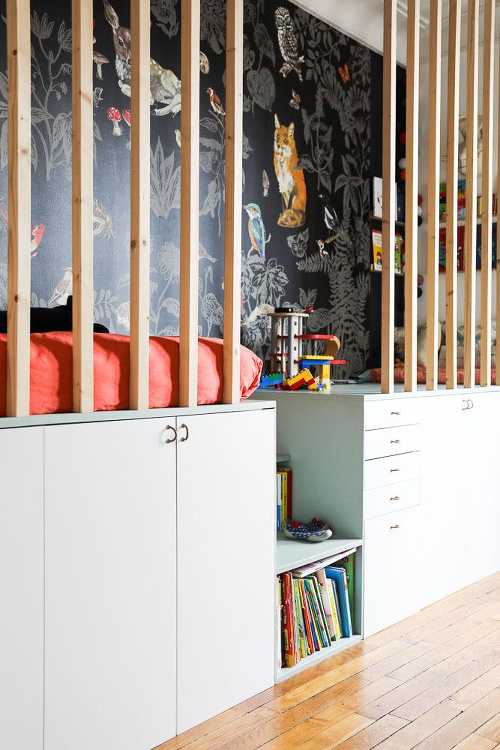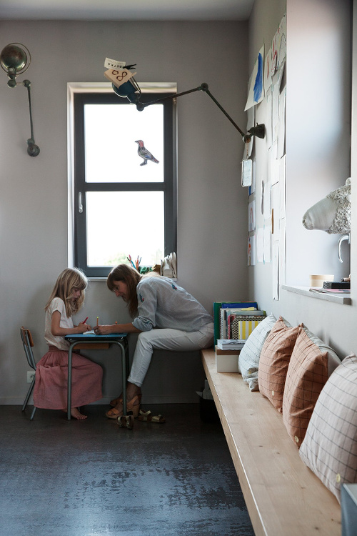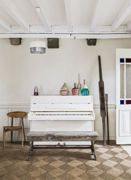 Associer vert céladon et bois clair (voir ici et là). Habiller un mur miroir en y scotchant aléatoirement différents types de photos (voir ici). Faire courir le long d'un mur une longue planche multifonction banc/étagère/bibliothèque (voir ici). Opter pour un plafond coloré twistant l'allure générale de la pièce (voir ici). Détourner un ancien bougeoir en réceptacle à petits bijoux de type bagues/boucles d'oreilles… (voir ici). Marier cannelle et bleu délavé (voir ici). Ne jamais sous-estimer la force artistique et insolite d'un trompe-l'oeil (voir ici). Chiner sa vaisselle (voir ici). Créer un espace de jeux ou de lecture pour ses enfants au dessus de meubles sur mesure (voir ici). Télescoper mobilier design et sol brut (voir ici). Remplacer le traditionnel tabouret de piano par un banc en bois joliment décrépi (voir ici). Investir dans un canapé aux dimensions incitant au farniente, aux batailles d'oreillers, aux séances de lecture groupée et aux pique-niques nocturnes (voir ici).