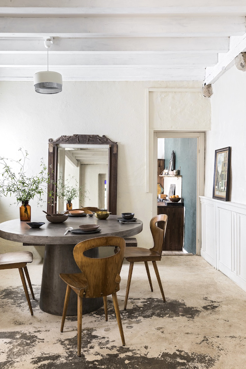 " l'esprit déco" est une notion que m'est étrangère et mon mari partage ce qui parait être pour beaucoup une forme de bizarrerie qui a parfois mis des personnes étrangement mal à l'aise! Les objets utilitaires de notre quotidien sont beaux, souvent rapportés de voyages ou objets anciens de nos familles respectives, mais ils ont tous et sans exception une fonction utilitaire, par exemple notre vaisselle en grès et ustensiles de cuisine japonais, lampes, fauteuils, banquettes ou étagères Knoll provenant de la collection du grand père de mon mari, ami de Knoll et de sa femme Florence. Il y a donc assez peu de meubles chez nous.