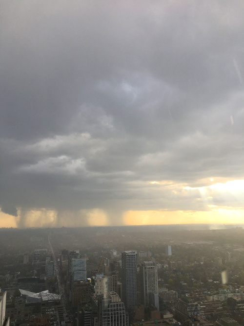 15h : 26 dollars (canadiens)… 26 dollars ! Composé de pousses d'épinards, de roquettes, de pommes, de kiwis, d'aubergines, de poires, de basilics, de curcuma frais, de mûres et de bananes, mon panier (bio) m'aurait facilement coûté le double chez Whole Food. Quelle satisfaction de réussir à faire ses courses alimentaires sans payer le prix d'un marketing surfant sur notre besoin de nous nourrir sainement ! Chez ce petit vendeur de fruits et légumes, aucune mise en rayon sexy, aucun packaging à la calligraphie aguicheuse, aucun emballage irrationnel, juste des produits frais et des jeunes femmes qui à la caisse positionnent spontanément et astucieusement mes achats pour ne pas que ceux-ci s'abîment… Sur le chemin du retour (qui nous prendra une bonne trentaine de minutes), nous savourons avec Julien notre nouveau mode de fonctionnement consistant à effectuer toutes nos courses à pied. Pour nous, ne plus avoir à grimper dans notre voiture pour aller d'un parking souterrain à un autre est tout simplement jouissif. Cela nous oblige par ailleurs à acheter différemment et à nous passer du superflu (au vu de l'espace limité de nos sacs à dos). Du coup, nous planifions systématiquement nos repas, nous mangeons mieux et éprouvons une réelle satisfaction à fournir une dépense énergétique pour aller chercher notre nourriture. Je n'en peux plus de cette culture du tout confort qui finit par nous priver de la joie savoureuse consécutive à l'effort... 19h : Du haut de notre 56e étage, nous voyons arriver au loin des rideaux de pluie bleutée. Ce spectacle silencieux et grandiose nous incite à savourer la chance que nous avons de vivre si près des nuages. Cela ne sera pas toujours le cas et nous en prenons de plus en plus conscience…