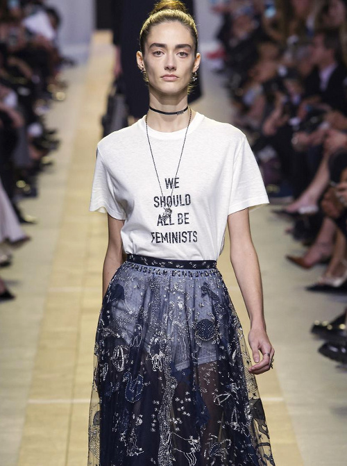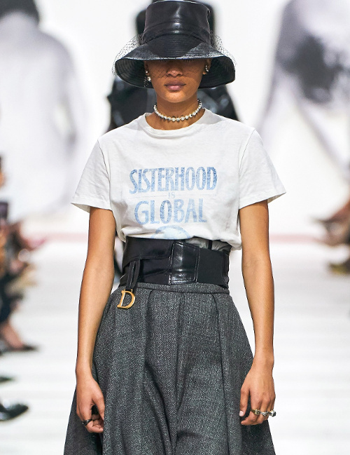 Prenons tout d'abord le cas de Maria Grazia Chiuri chez Dior. En affichant son féminisme au sein de collections riches en tee-shirts "goodies" pour féministe richissime (710 dollars pour le modèle "We should all be feminists" et probablement tout autant pour le petit dernier "Sisterhood is global"), cette ancienne complice de Pierpaolo Piccioli (époque Valentino) réussit à focaliser l'attention sur sa dimension "première de cordée" (elle est la première DA femme chez Dior), reléguant ainsi au second plan le manque de virtuosité de ses créations. Peu importe la faiblesse des collections Dior, tant que le message de la griffe flatte l'air du temps…