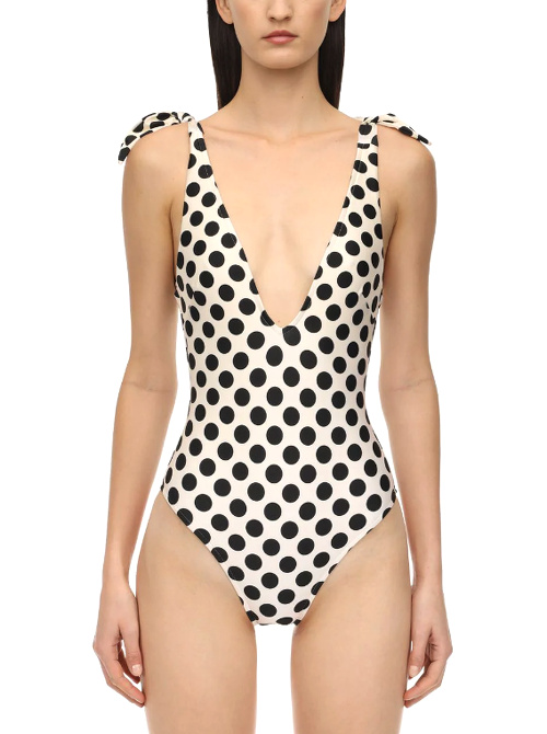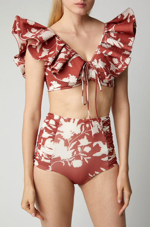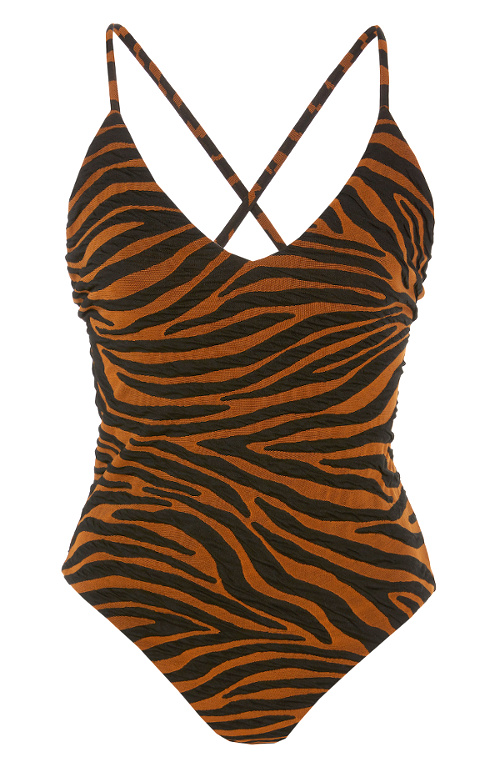 Les inconditionnelles des tatouages éphémères succomberont à ce modèle Zimmerman leur assurant une marque de bronzage esprit "body art". Riche de sa saveur fifties, le vichy se retrouve cette saison aussi bien sur les costumes pour trendsetteuse sirotant un golden latte en terrasse que sur les mignonneries destinées à aller tester la température de la Méditerranée. On note au passage que ces dernières, n'ayant pas peur du premier degré, n'hésitent pas à faire la part belle aux volants, fronces et autres fantaisies girly... n'en déplaise aux amoureuses du minimalisme (J.Crew, J.Crew, Ganni, Caroline Constas). Les découpes latérales se la jouent solo (Anthropologie, Ganni). Celles n'en n'ayant toujours pas fini avec la tendance "logo" n'auront que l'embarras du choix, leur fournisseur officiel s'étant fait une joie de produire quelques maillots de bain pour femme-sandwich consentante (voir ici, ici, ici et là). Afin d'éviter tout malentendu, les maillots de bain affichant des velléités lingerie seront à ostraciser (Oséree). recule pour laisser la place aux zébrures tigrées (Mara Hoffman, Ganni). Les noeuds à nouer gagnent en ampleur (Lisa Marie Fernandez, Bondi Born). Bien coupés et féminins sans être aguicheur, les maillots une pièce Love Stories semblent directement destinées aux adolescentes et préadolescentes. Le maillot de bain spécial activités nautiques aime à twister sa nature pragmatique au contact d'imprimés fantaisies, et c'est tant mieux ! (J.Crew) Le mix pois (ou imprimés dans le même esprit)/swimwear continue d'être une bonne idée, et ce quel que soit le style du modèle de maillot de bain (Billabong, Zimmerman, Whistles, ).