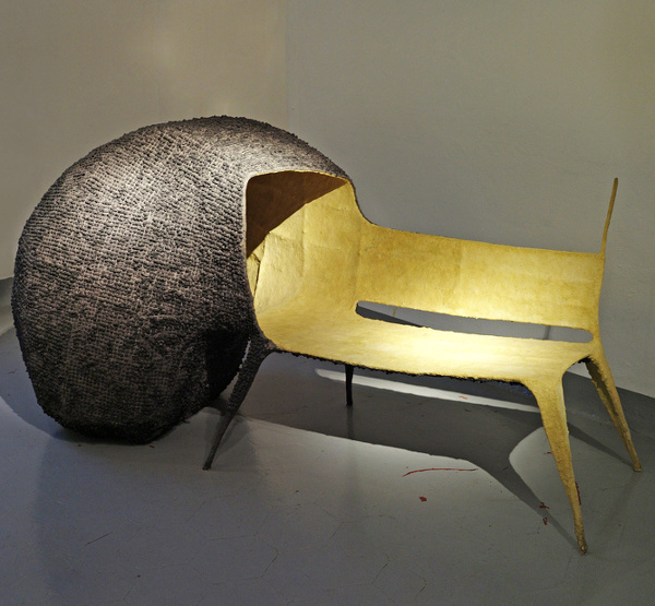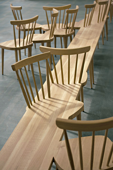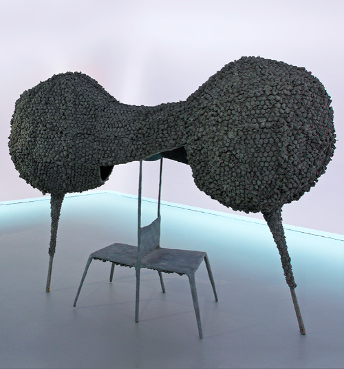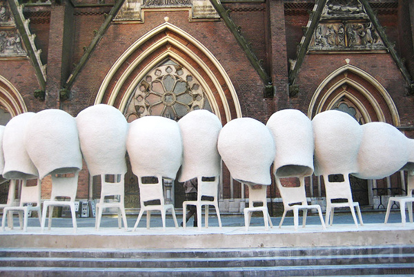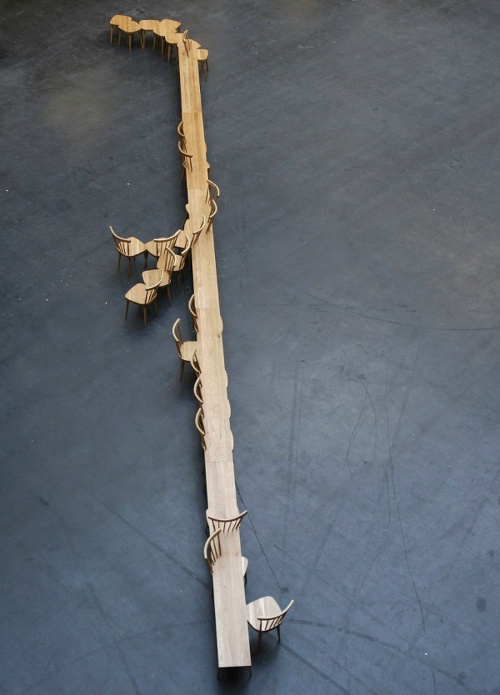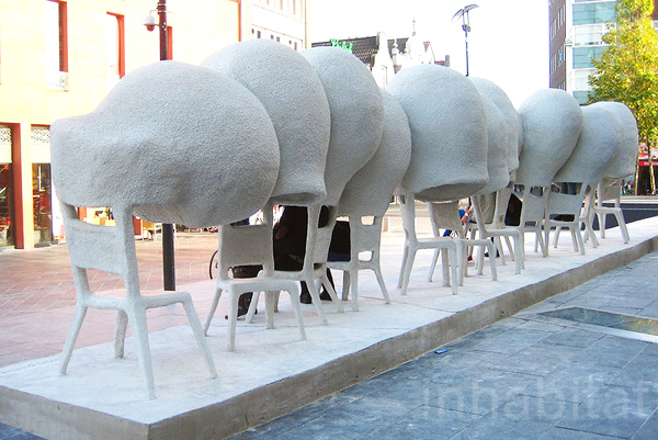 Invité par la ville d'Eindhoven à concevoir une installation d'art public devant se situer sur le parvis de la cathédrale, l'espagnol Nacho Carbonell imagina une succession de chaises reliées par des bulles de ciment pulvérisé. Tels des confessionnaux pour passant en quête de lien social ou de pause urbaine, ces morphings communiquant par de petites percées intérieures permettent à chacun soit d'échanger avec son voisin, soit de s'abîmer dans une méditation passagère. Communiquer ou se recentrer : deux actions que Nacho Carbonell aime à flatter via des créations ludiques (voir ici, ici, et là).