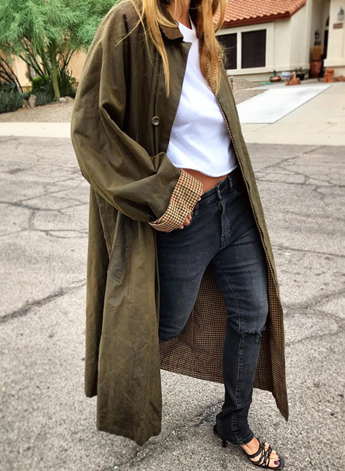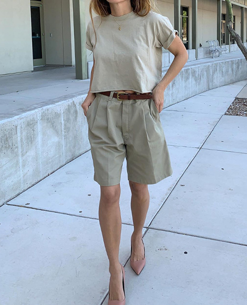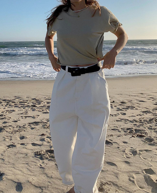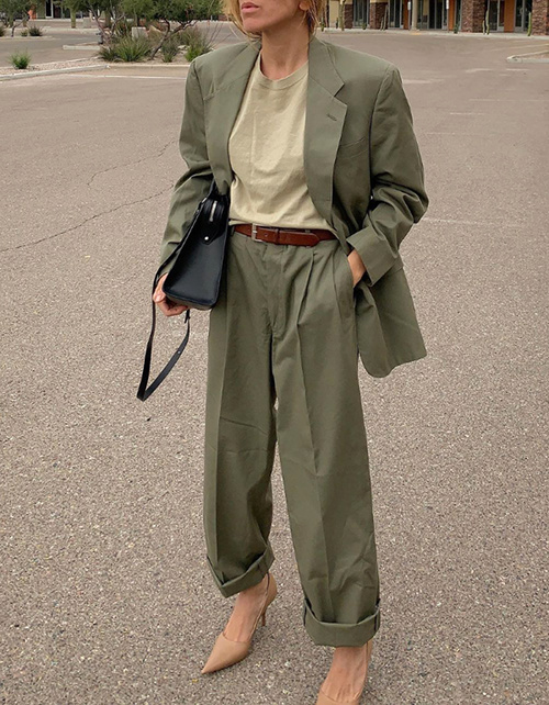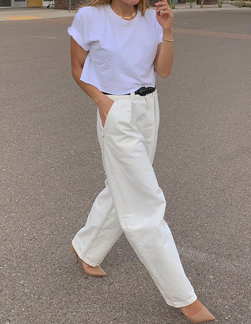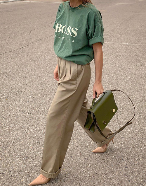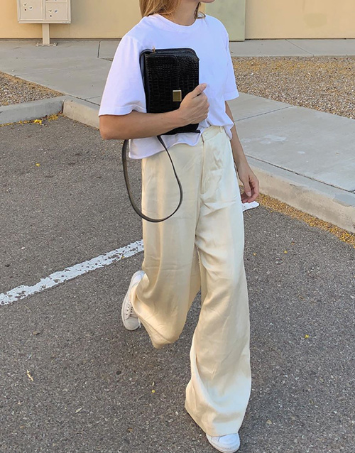 Marier jaune pâle, jean javellisé et nude (voir ici). Porter ses jeans - ou pantalons - larges taille haute avec un ample tee-shirt cropped (voir ici et là). Traiter le pantalon en soie en tant que baggy à part entière (voir ici). Réchauffer une mini robe droite au contact d'un blazer oversize (voir ici). Féminiser ses jeans larges en les portant roulottés sur une paire d'escarpins ou de mules à talons (voir ici et là). Twister le bermuda à pinces à coups d'escarpins et de tee-shirt cropped (voir ici). Réinventer l'art de porter le costume en roulottant le pantalon sur la cheville, en optant pour une veste trop grande et en assaisonnant le tout d'un tee-shirt loose et d'une paire de sandales minimalistes (voir ici et là). Associer vert lichen et marron chocolat au lait (voir ici).